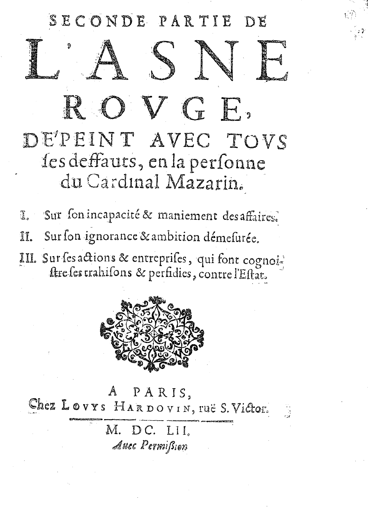 SECONDE PARTIE DE L’ASNE ROVGE, DÉPEINT AVEC TOVS ses deffauts, en la personne du Cardinal Mazarin. I. Sur son incapacité & maniement des affaires. II. Sur son ignorance & ambition démesurée. III. Sur ses actions & entreprises, qui font cognoistre ses trahisons & perfidies, contre l’Estat.