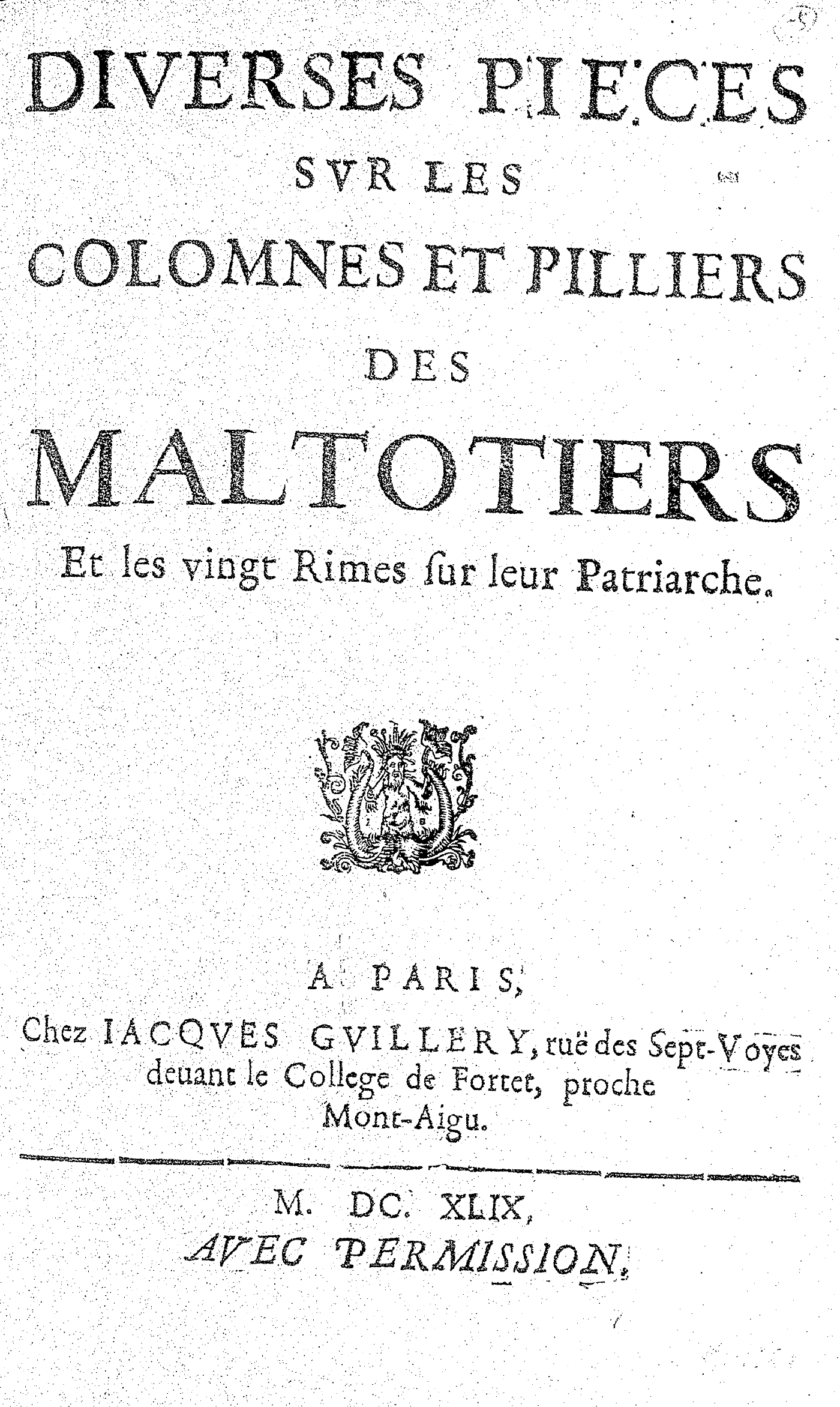 DIVERSES PIECES SVR LES COLOMNES ET PILLIERS DES MALTOTIERS Et les vingt Rimes sur leur Patriarche.