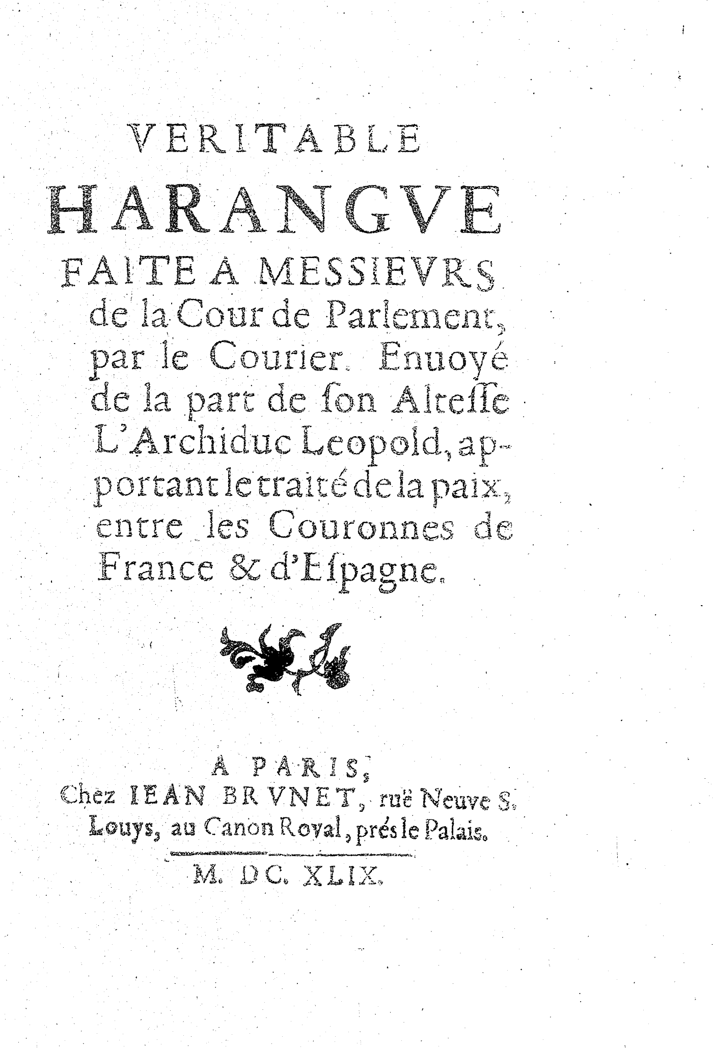 VERITABLE HARANGVE FAITE A MESSIEVRS de la Cour de Parlement, par le Courier. Enuoyé de la part de son Altesse L’Archiduc Leopold, apportant le traité de la paix, entre les Couronnes de France & d’Espagne.