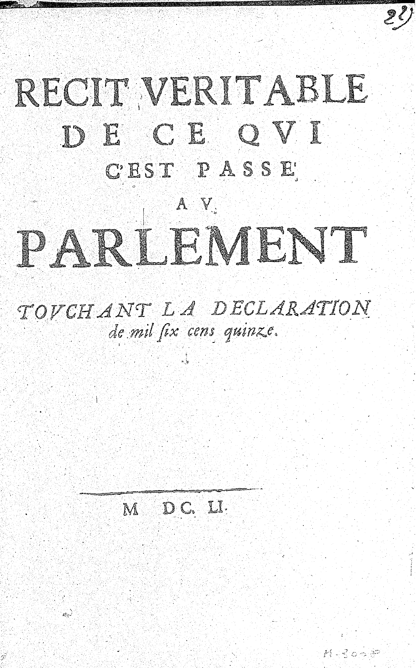 RECIT VERITABLE DE CE QVI C’EST PASSÉ AV PARLEMENT TOVCHANT LA DECLARATION de mil six cens quinze.