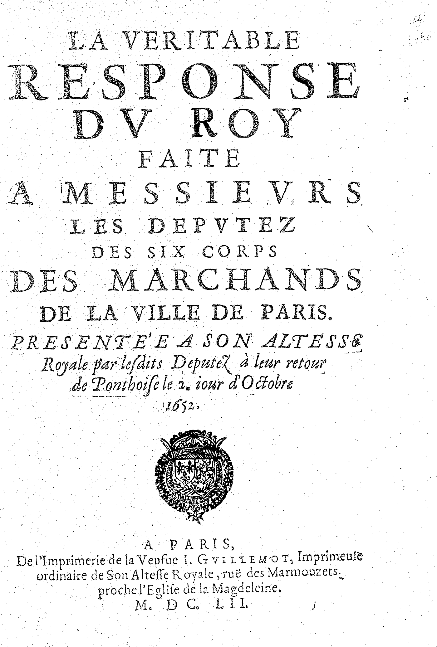 LA VERITABLE RESPONSE DV ROY FAITE A MESSIEVRS LES DEPVTEZ DES SIX CORPS DES MARCHANDS DE LA VILLE DE PARIS. PRESENTÉE A SON ALTESSE Royale par lesdits Deputez à leur retour de Ponthoise le 2. iour d’Octobre 1652.