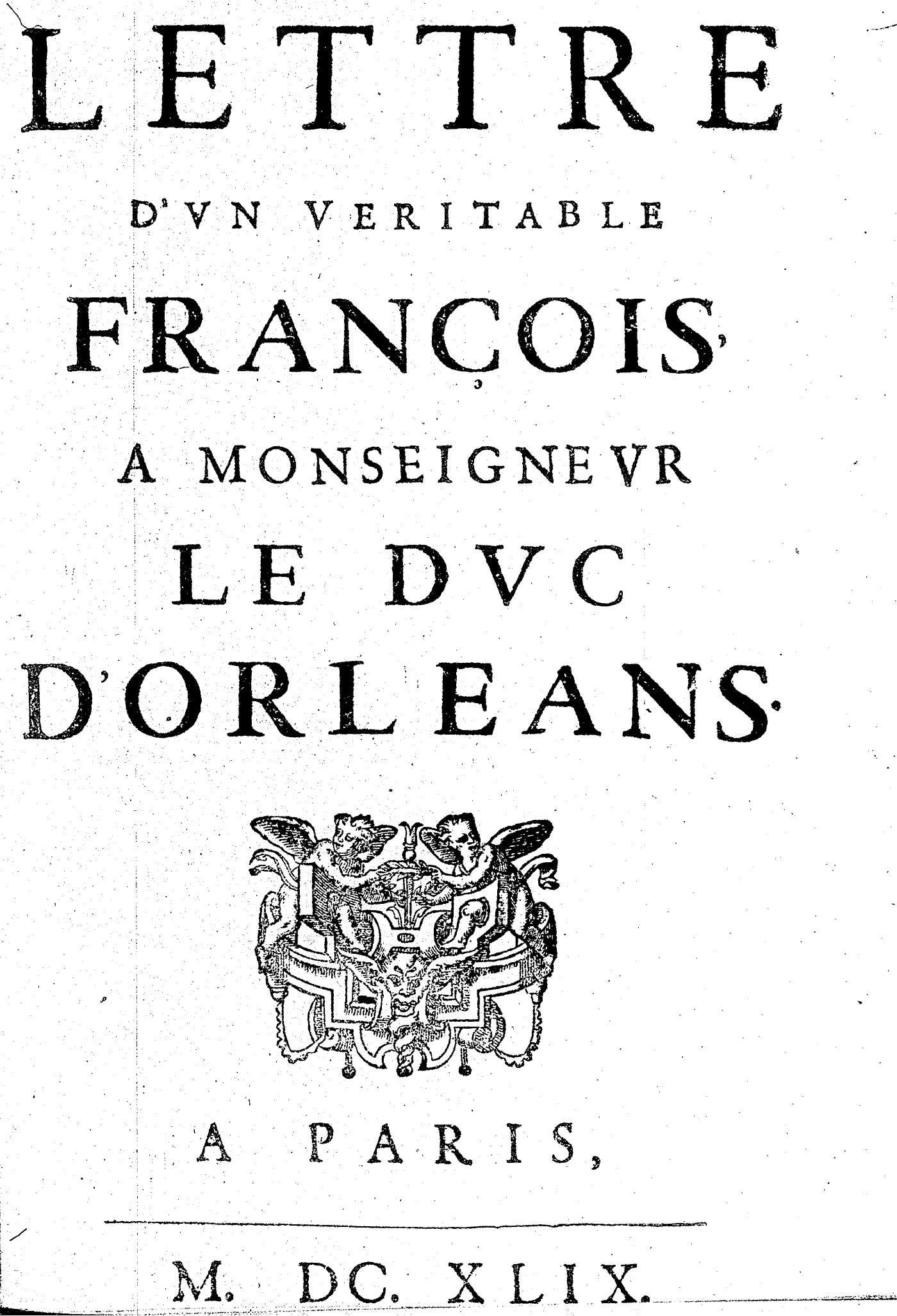 LETTRE D’VN VERITABLE FRANÇOIS, A MONSEIGNEVR LE DVC D’ORLEANS.