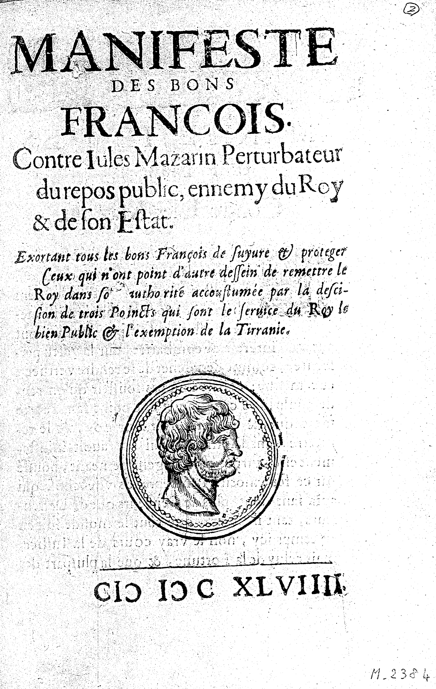 MANIFESTE DES BONS FRANCOIS. Contre Iules Mazarin Perturbateur du repos public, ennemy du Roy & de son Estat. Exortant tous les bons François de suyure & proteger Ceux qui n’ont point d’autre dessein de remettre le Roy dans sõ authorité accoustumée par la descision de trois Poincts qui sont le seruice du Roy le bien Public & l’exemption de la Tirranie.