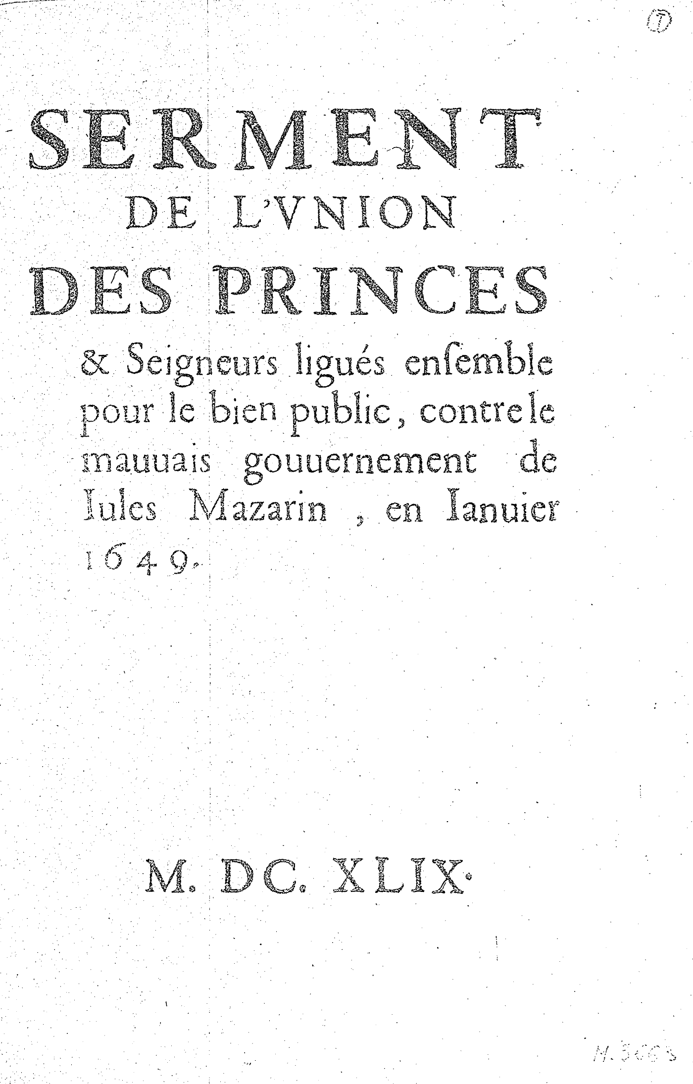 SERMENT DE L’VNION DES PRINCES & Seigneurs ligués ensemble pour le bien public, contre le mauuais gouuernement de Iules Mazarin, en Ianuier 1649.