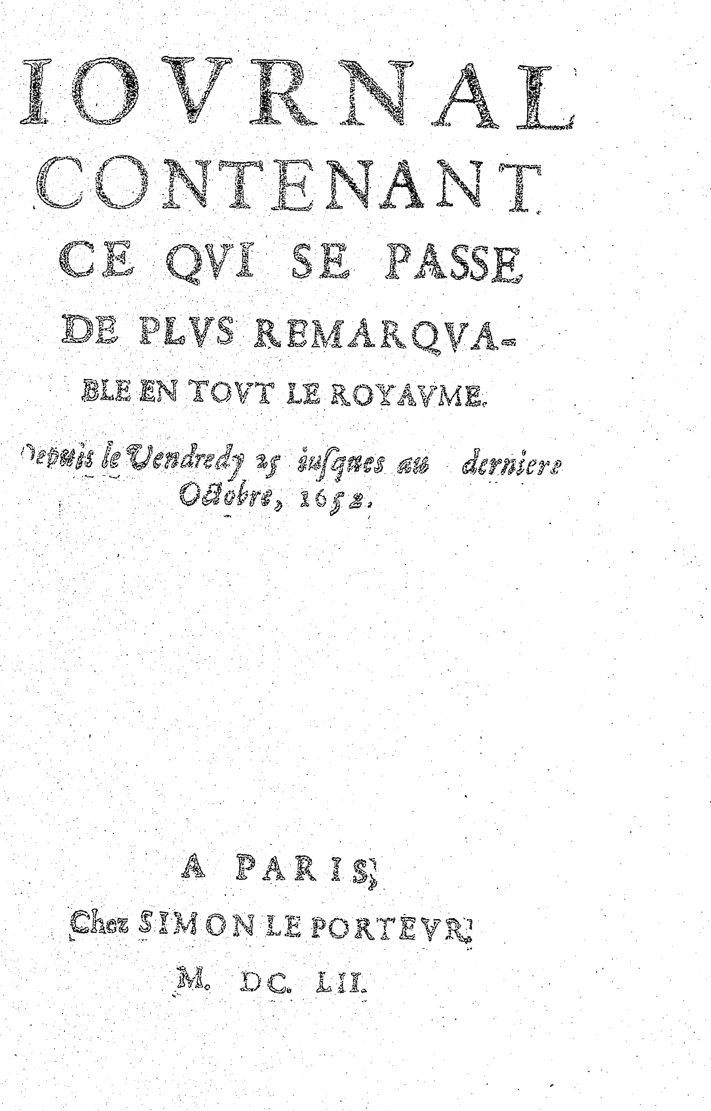 IOVRNAL CONTENANT CE QVI SE PASSE DE PLVS REMARQVABLE EN TOVT LE ROYAVME. Depuis le Vendredy 25 iusques au dernier Octobre, 1652.