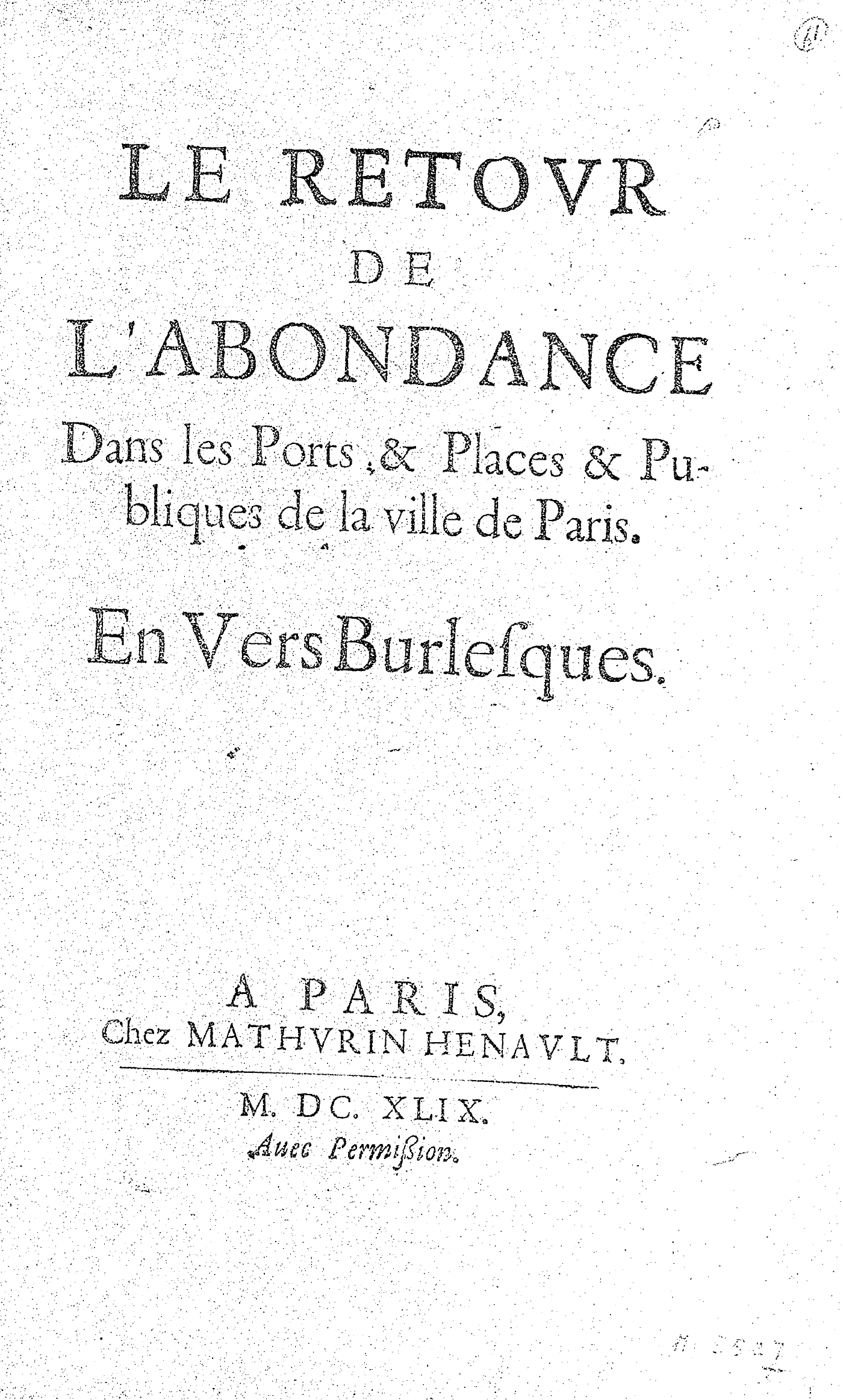 LE RETOVR DE L’ABONDANCE Dans les Ports & Places & Publiques de la ville de Paris. En Vers Burlesques.