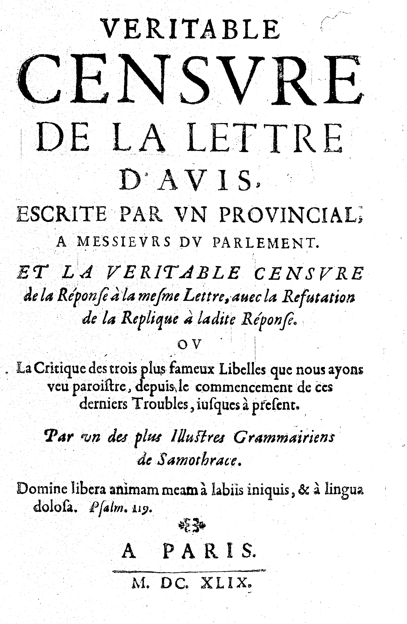 VERITABLE CENSVRE DE LA LETTRE D’AVIS, ESCRITE PAR VN PROVINCIAL, A MESSIEVRS DV PARLEMENT. ET LA VERITABLE CENSVRE de la Réponse à la mesme Lettre, auec la Refutation de la Replique à ladite Réponse. OV La Critique des trois plus fameux Libelles que nous ayons veu paroistre, depuis le commencement de ces derniers Troubles, iusques à present. Par vn des plus Illustres Grammairiens de Samothrace. Domine libera animam meam à labiis iniquis, & à lingua dolosa. Psalm. 119.