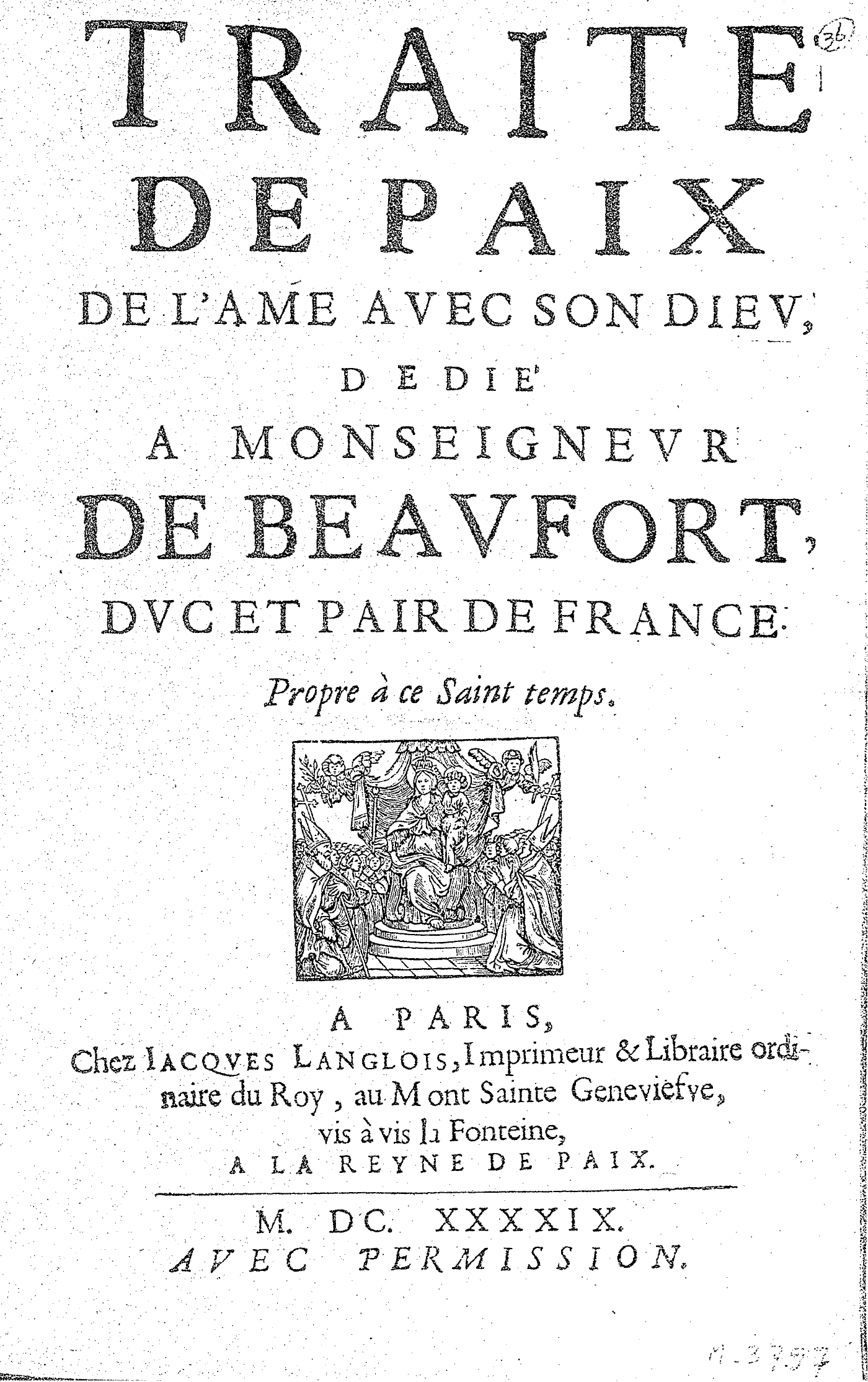TRAITÉ DE PAIX DE L’AME AVEC SON DIEV, DE DIÉ A MONSEIGNEVR DE BEAVFORT, DVC ET PAIR DE FRANCE. Propre à ce Saint temps.