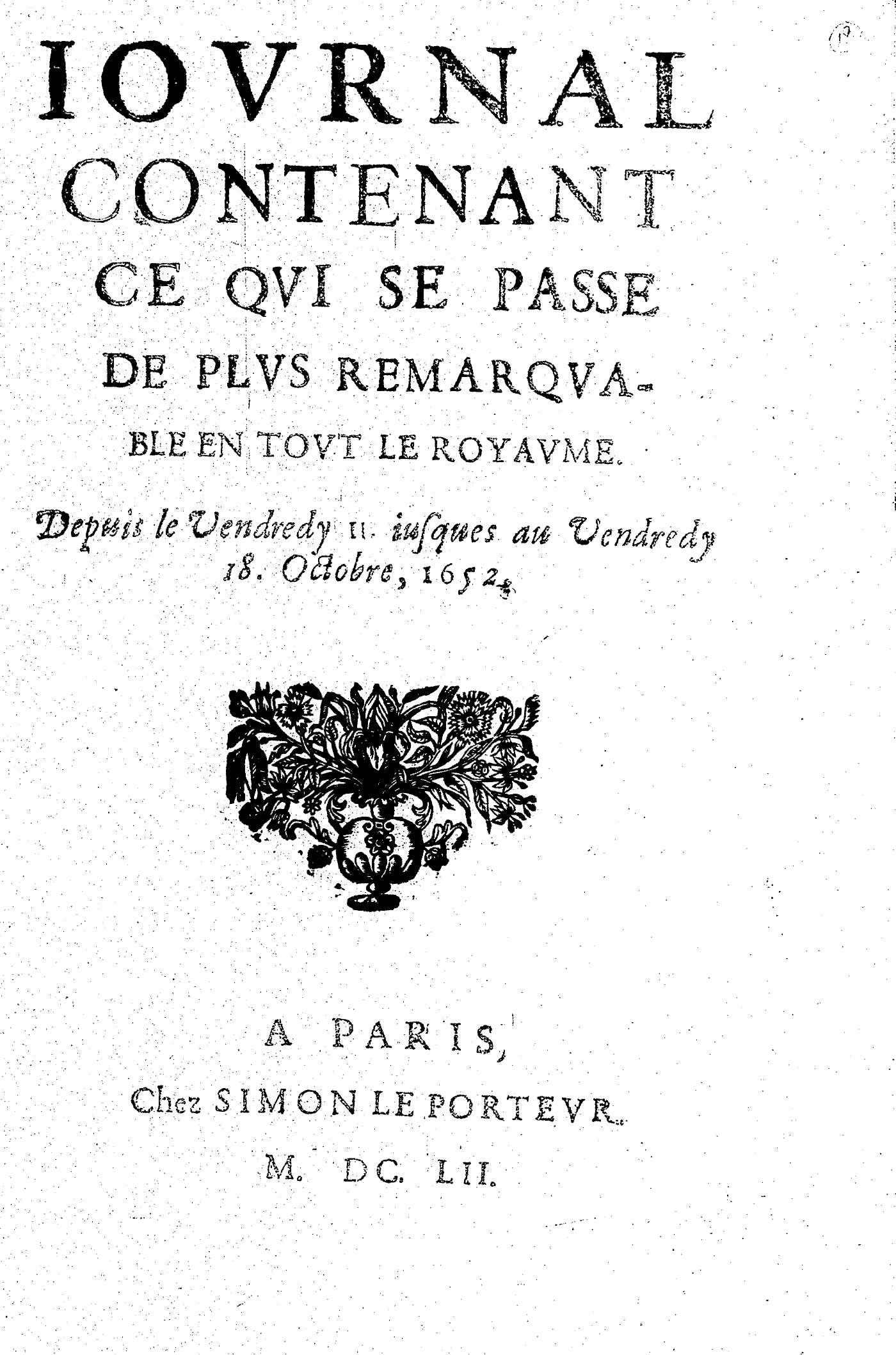 IOVRNAL CONTENANT CE QVI SE PASSE DE PLVS REMARQVABLE EN TOVT LE ROYAVME. Depuis le Vendredy 11. iusques au Vendredy 18. Octobre, 1652.