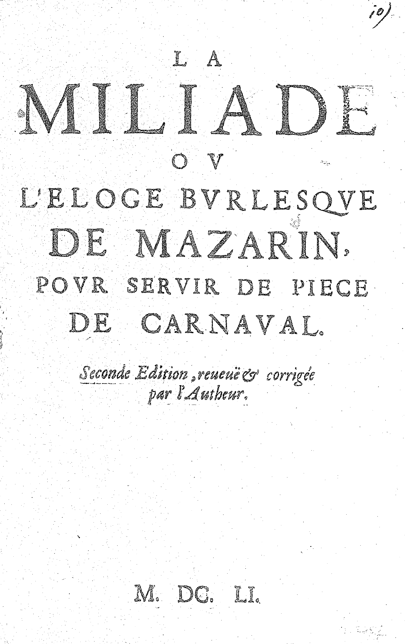 LA MILIADE OV L’ELOGE BVRLESQVE DE MAZARIN, POVR SERVIR DE PIECE DE CARNAVAL. Seconde Edition, reueuë & corrigée par l’Autheur.