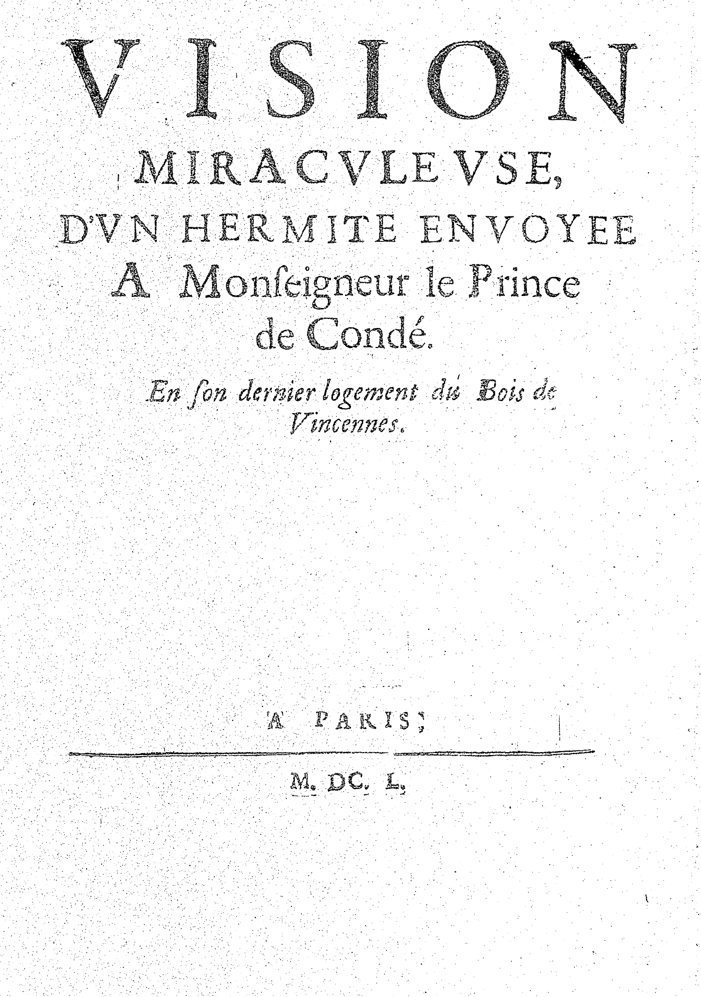 VISION MIRACVLEVSE, D’VN HERMITE ENVOYEE A Monseigneur le Prince de Condé. En son dernier logement du Bois de Vincennes.