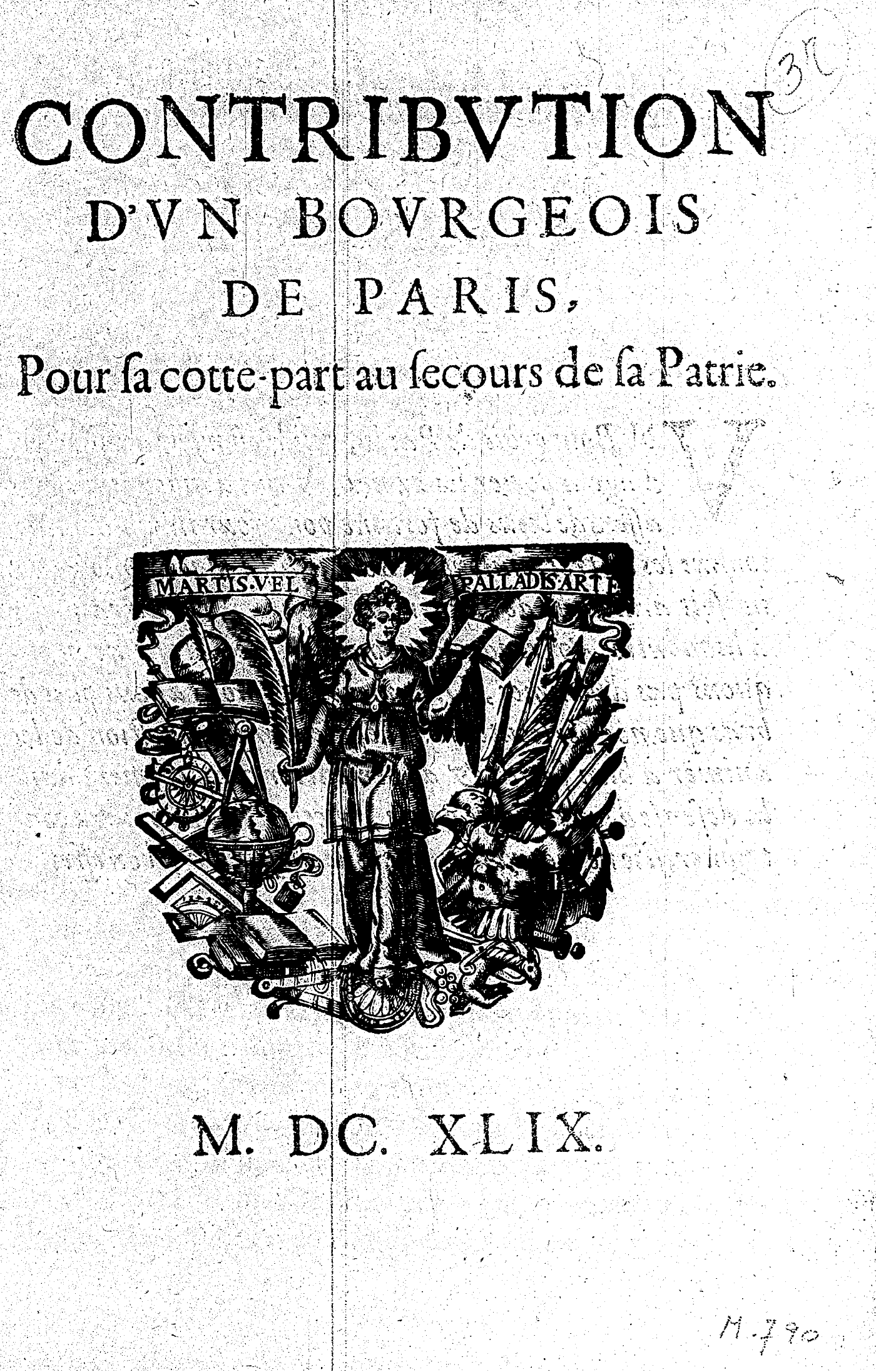 CONTRIBVTION D’VN BOVRGEOIS DE PARIS, Pour sa cotte-part au secours de sa Patrie.