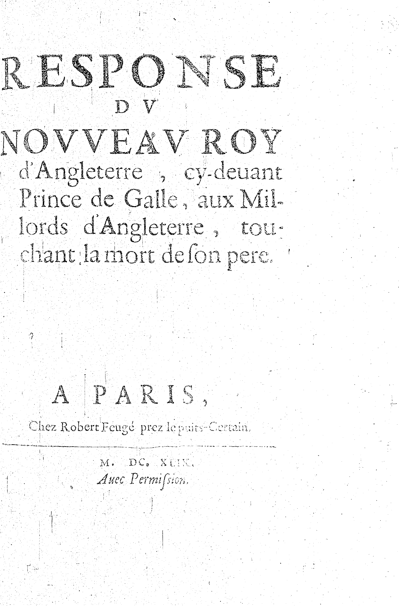 RESPONSE DV NOVVEAV ROY d’Angleterre, cy-deuant Prince de Galle, aux Millords d’Angleterre, touchant la mort de son pere.