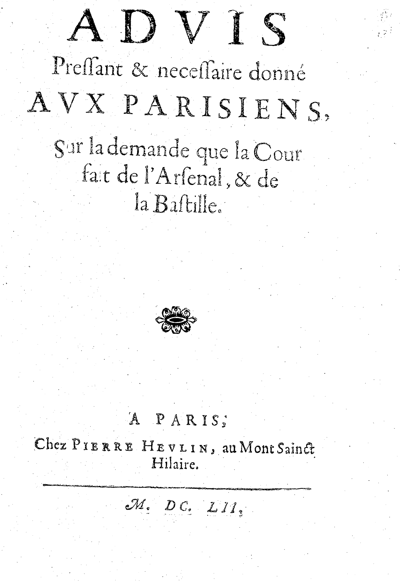 ADVIS Pressant & necessaire donné AVX PARISIENS, Sur la demande que la Cour fait de l’Arsenal, & de la Bastille.