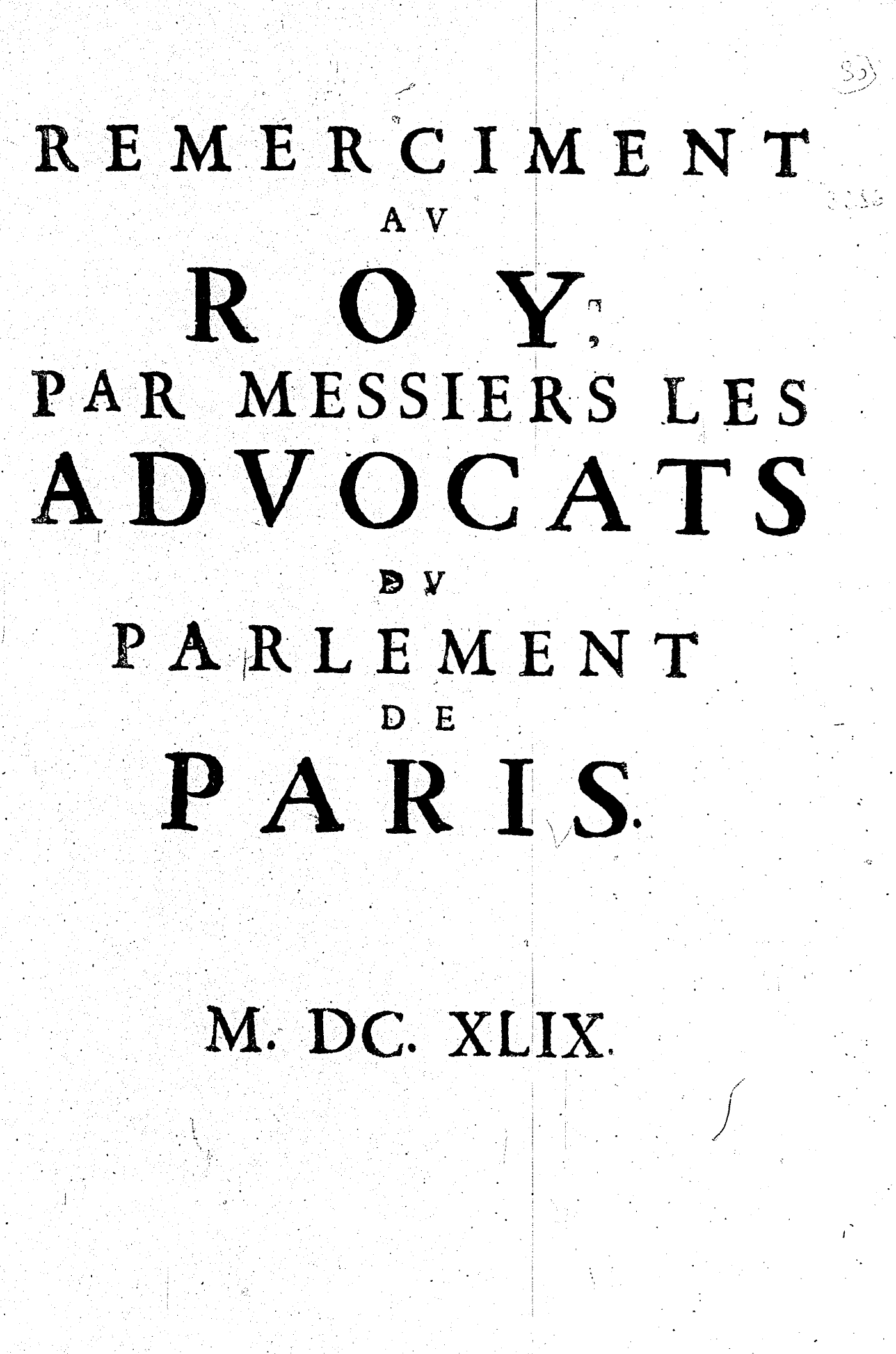 REMERCIMENT AV ROY, PAR MESSIERS LES ADVOCATS DV PARLEMENT DE PARIS.
