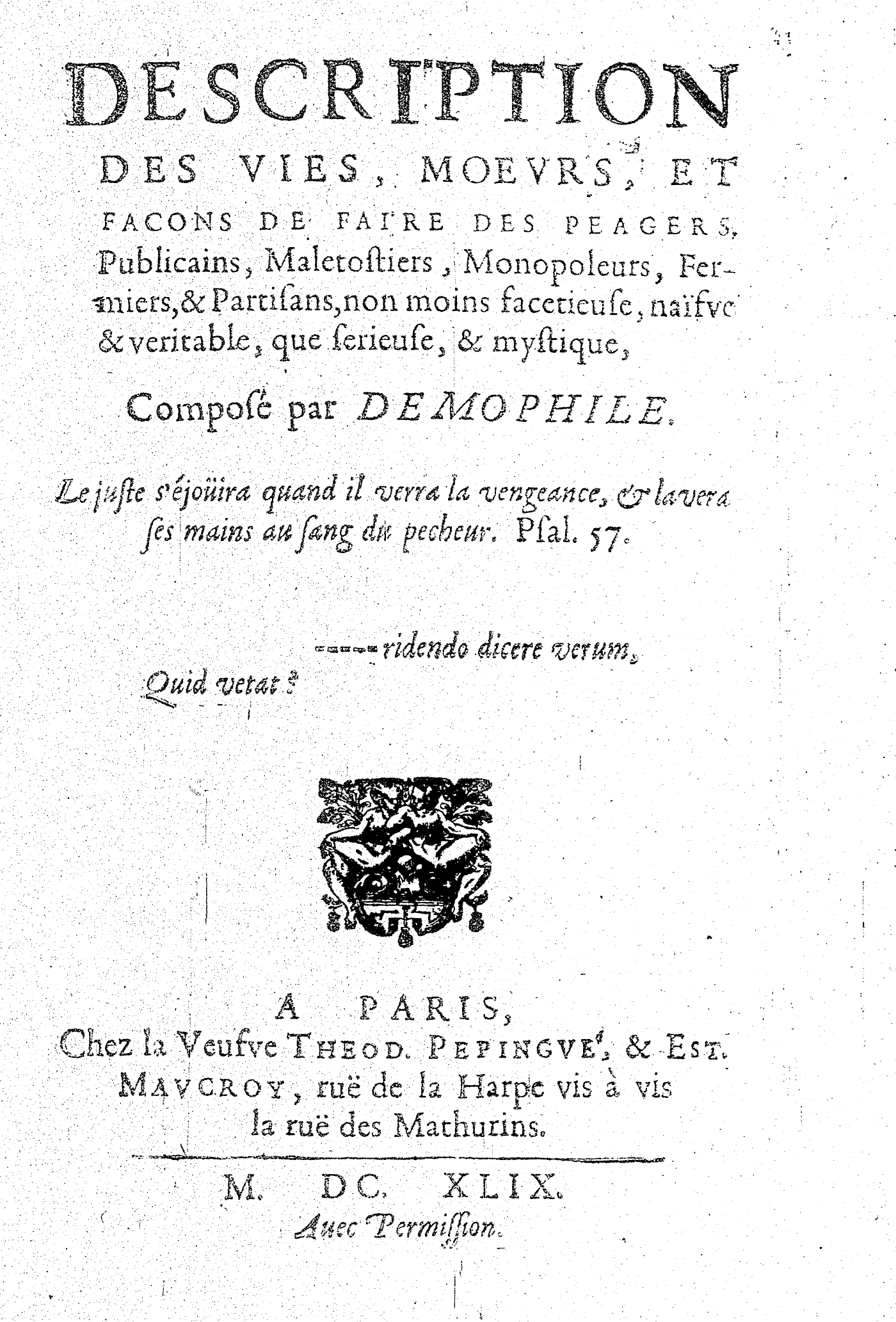 DESCRIPTION DES VIES, MOEVRS, ET FACONS DE FAIRE DES PEAGERS, Publicains, Maletostiers, Monopoleurs, Fermiers, & Partisans, non moins facetieuse, naïfve & veritable, que serieuse, & mystique, Composé par DEMOPHILE.