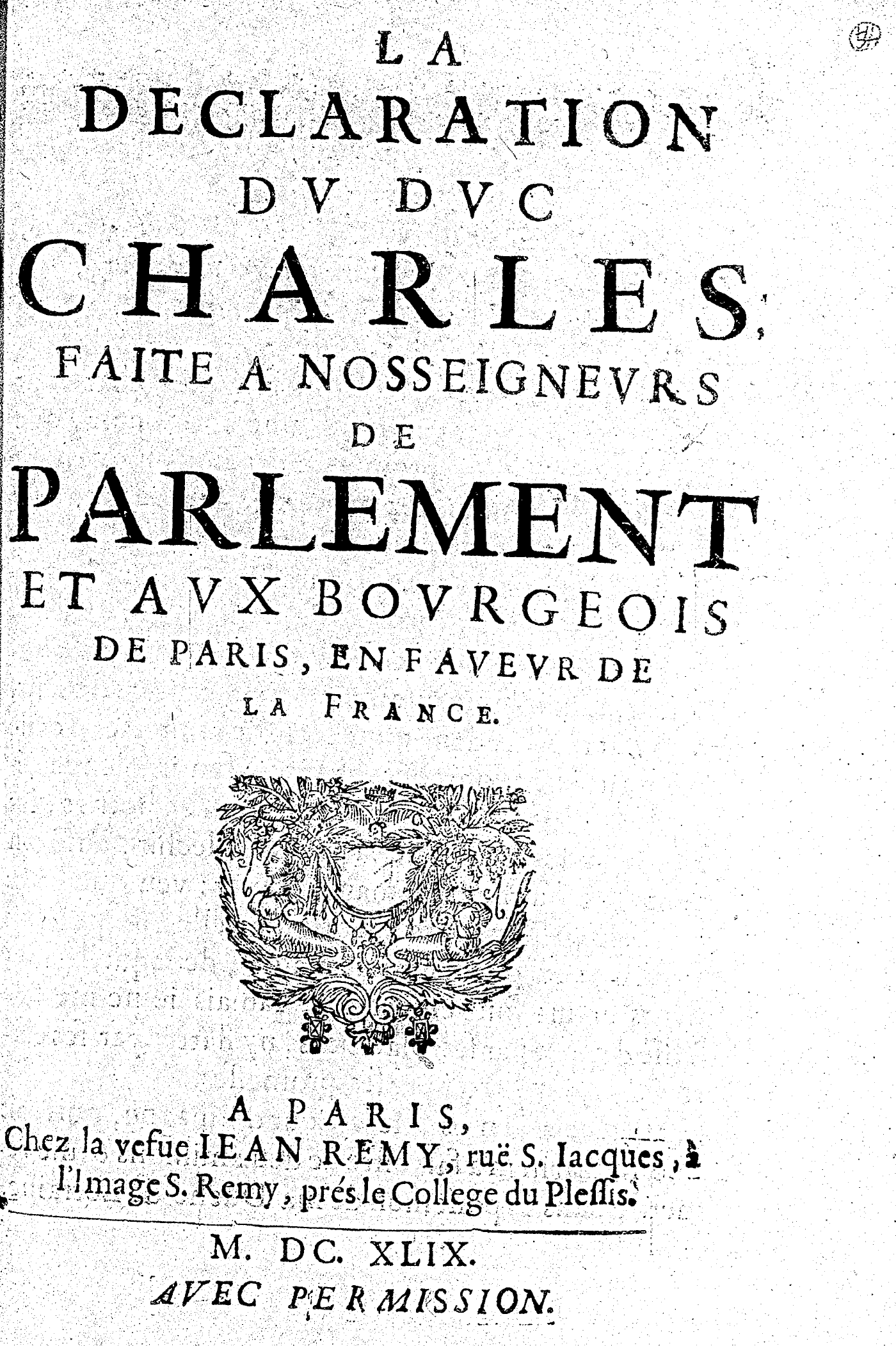 LA DECLARATION DV DVC CHARLES FAITE A NOSSEIGNEVRS DE PARLEMENT ET AVX BOVRGEOIS DE PARIS, EN FAVEVR DE LA FRANCE.