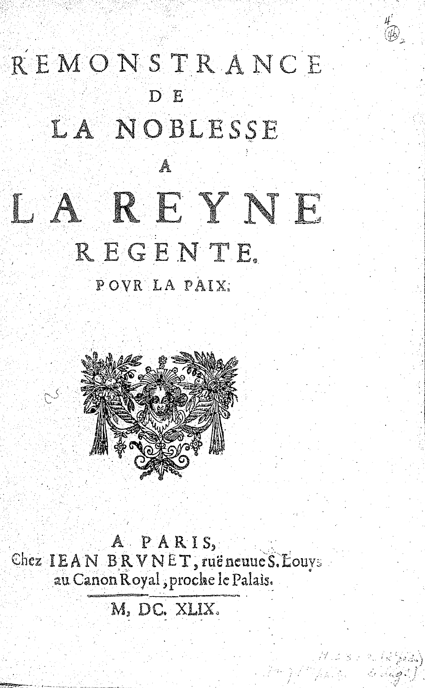 REMONSTRANCE DE LA NOBLESSE A LA REYNE REGENTE. POVR LA PAIX.