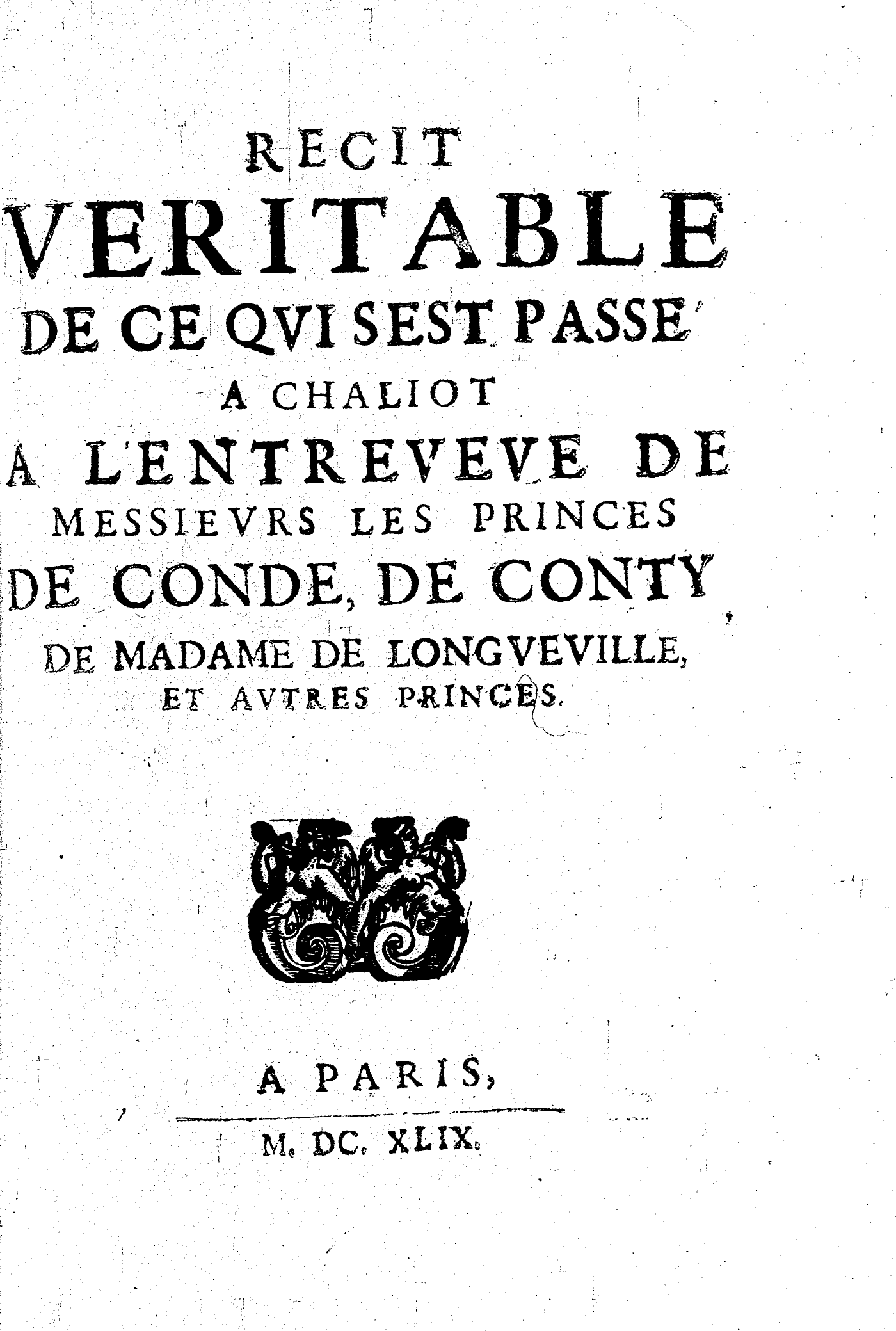 RECIT VERITABLE DE CE QVI SEST PASSÉ A CHALIOT A L’ENTREVEVE DE MESSIEVRS LES PRINCES DE CONDE, DE CONTY DE MADAME DE LONGVEVILLE, ET AVTRES PRINCES.
