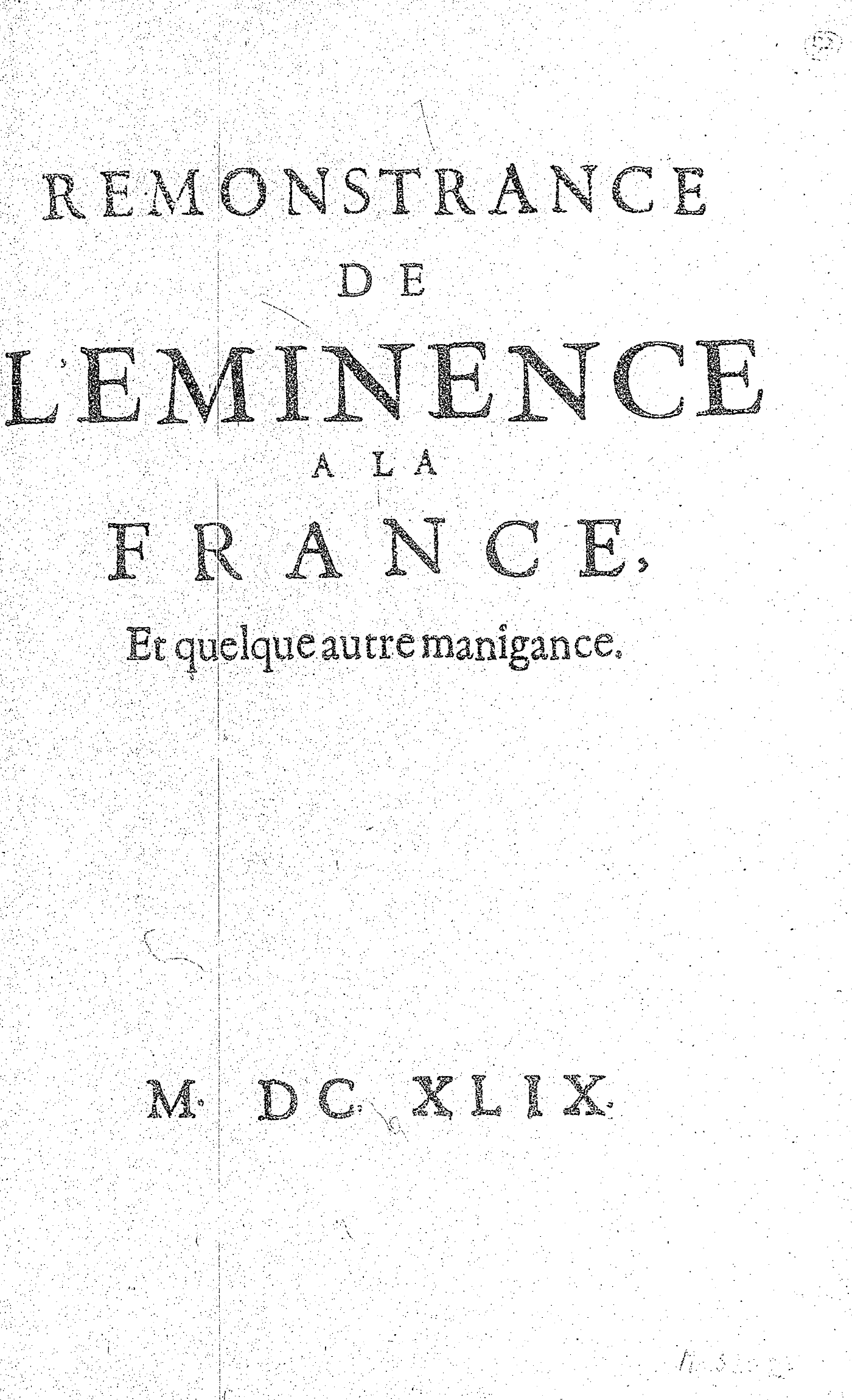 REMONSTRANCE DE L’EMINENCE A LA FRANCE, Et quelque autre manigance.