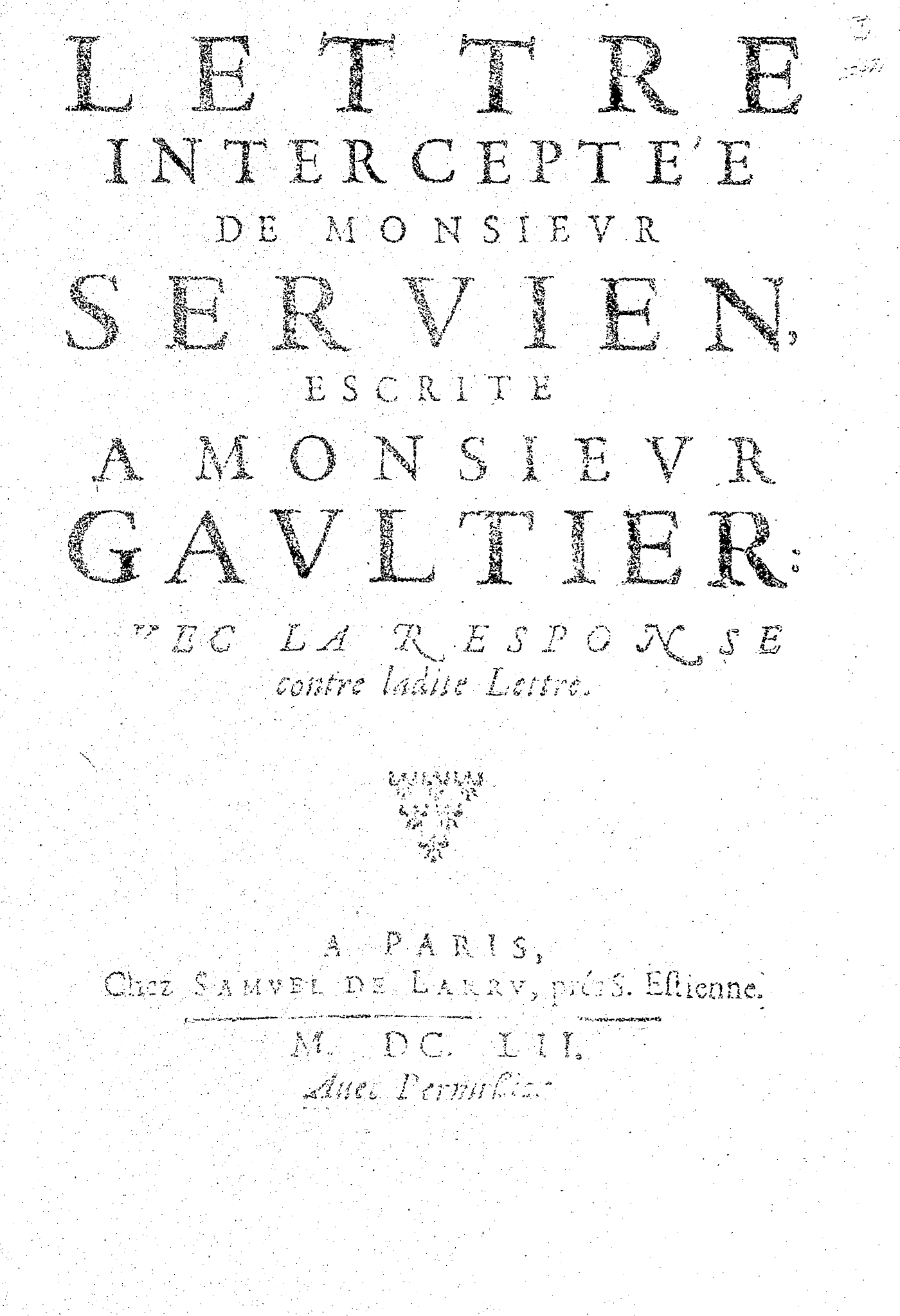 LETTRE INTERCEPTÉE DE MONSIEVR SERVIEN, ESCRITE A MONSIEVR GAVLTIER : AVEC LA RESPONSE contre ladite Lettre.
