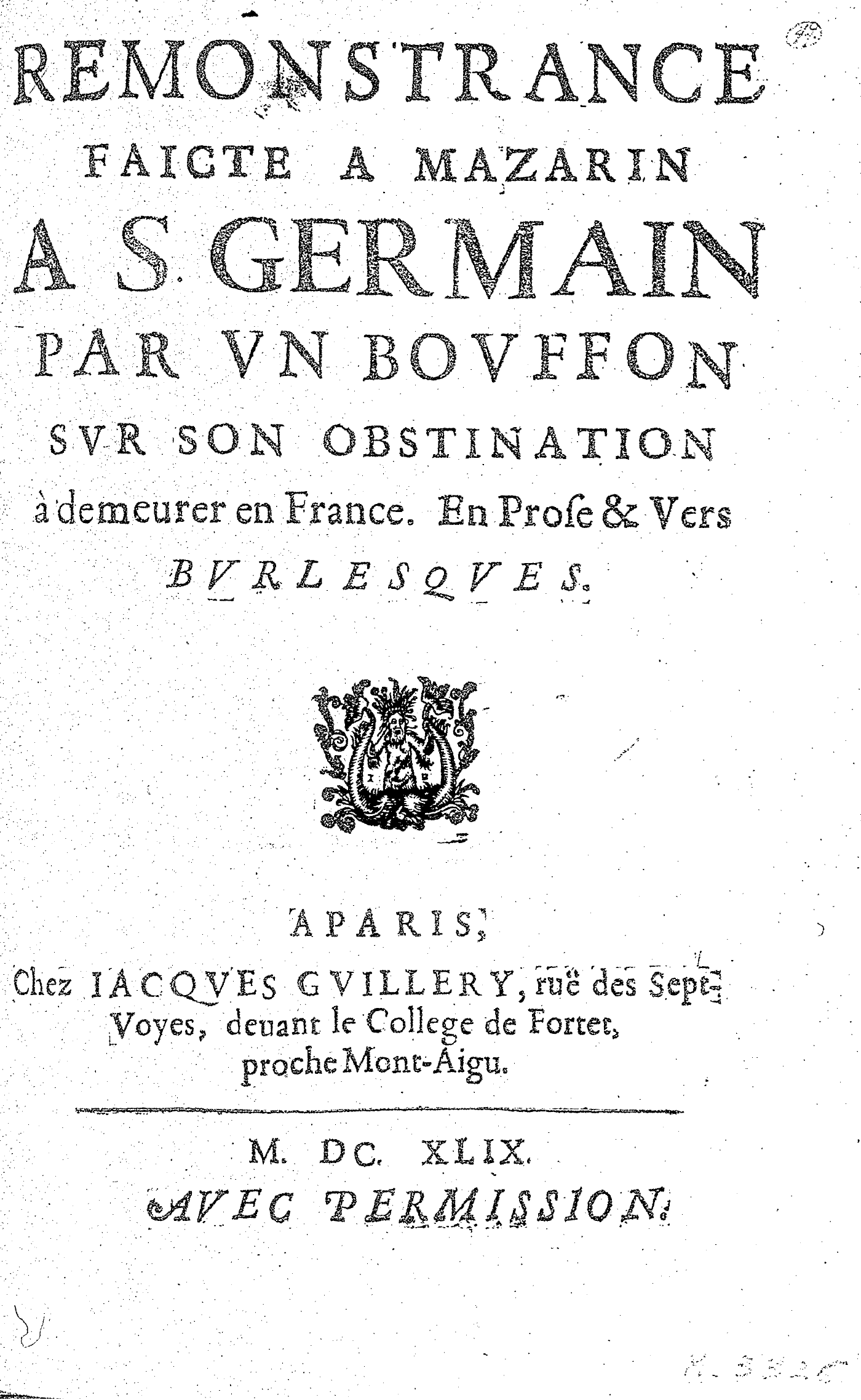 REMONSTRANCE FAICTE A MAZARIN A S. GERMAIN PAR VN BOVFFON SVR SON OBSTINATION à demeurer en France. En Pose & Vers BVRLESQVES.