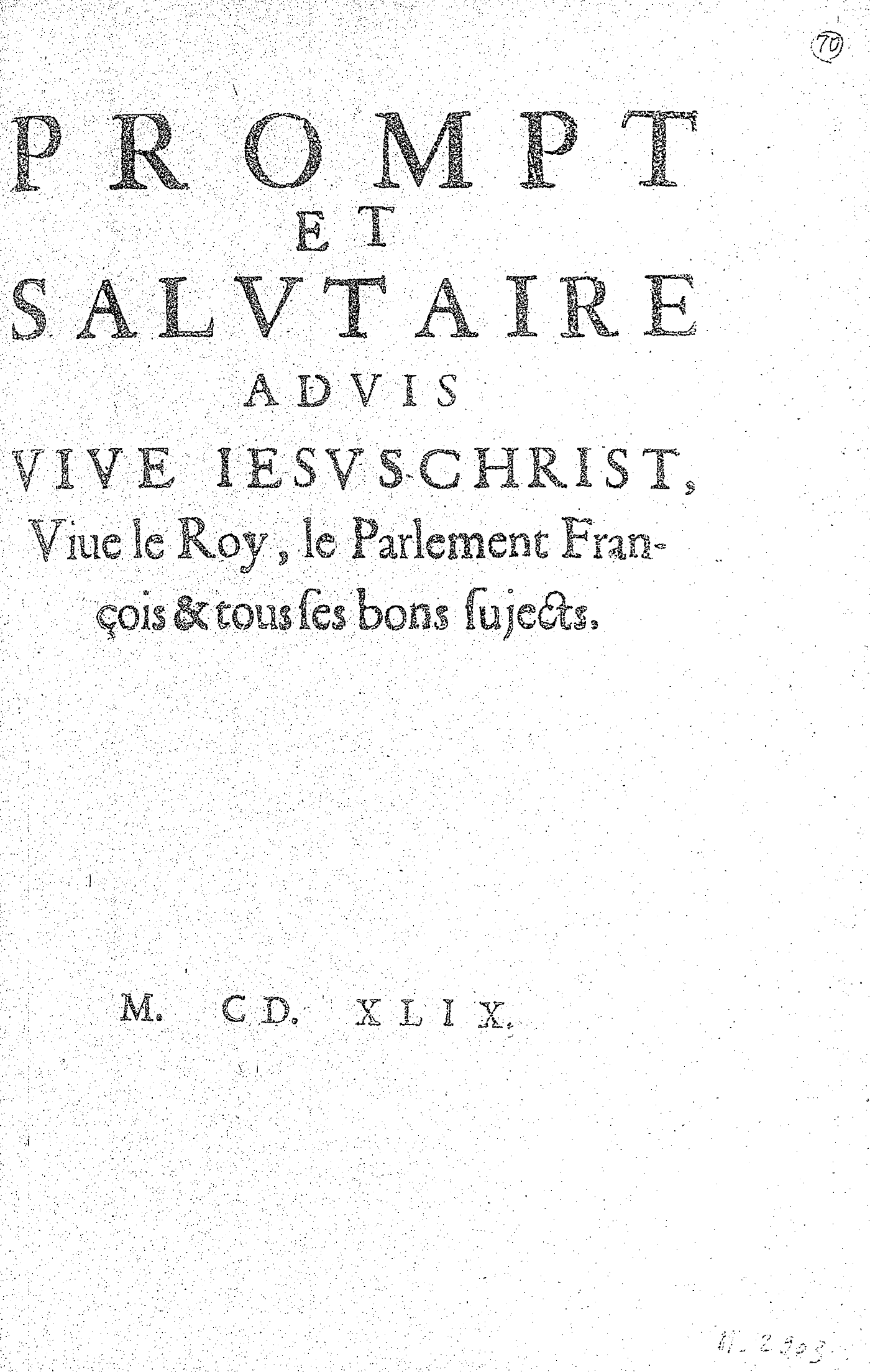 PROMPT ET SALVTAIRE ADVIS VIVE IESVS CHRIST, Viue le Roy, le Parlement François & tous ses bons sujects.