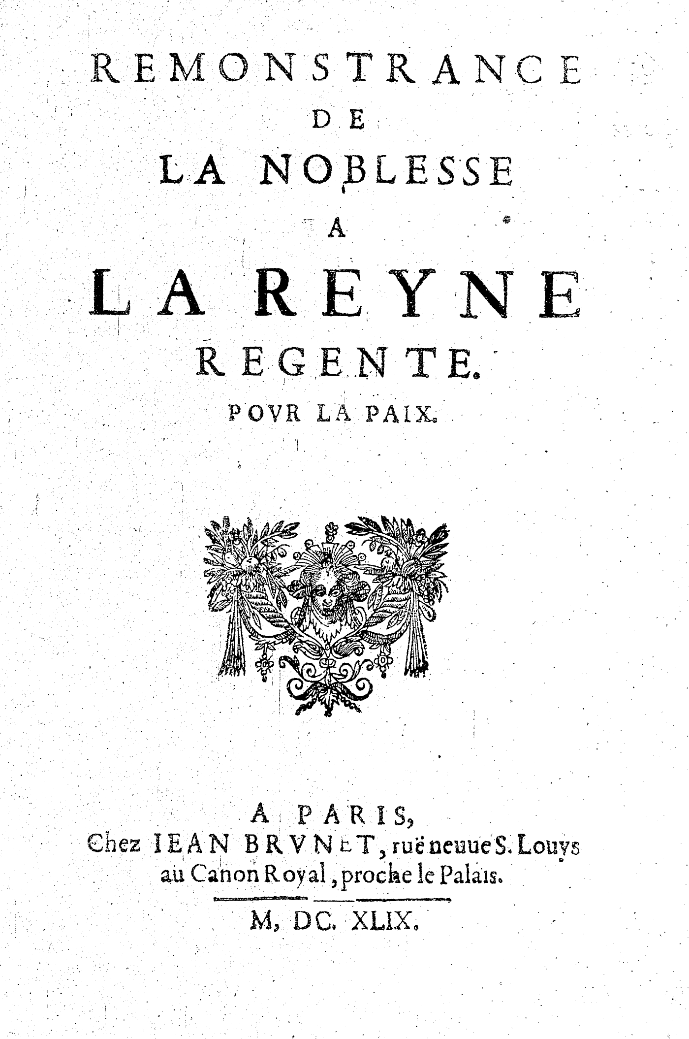 REMONSTRANCE DE LA NOBLESSE A LA REYNE REGENTE. POVR LA PAIX.