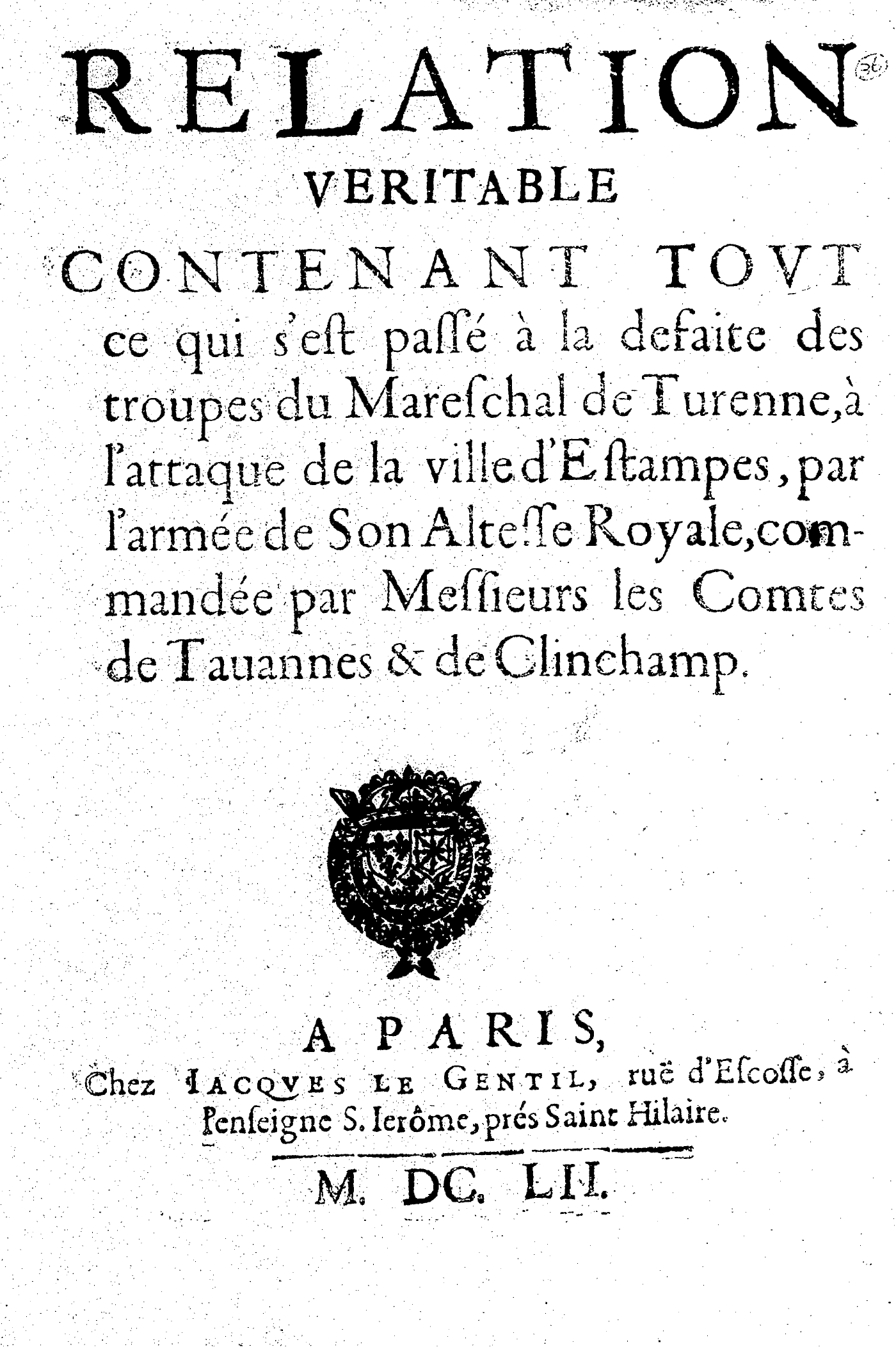 RELATION VERITABLE CONTENANT TOVT ce qui s’est passé à la defaite des troupes du Mareschal de Turenne, à l’attaque de la ville d’Estampes, par l’armée de son Altesse Royale, commandée par Messieurs les Comtes de Tauannes & de Clinchamp.