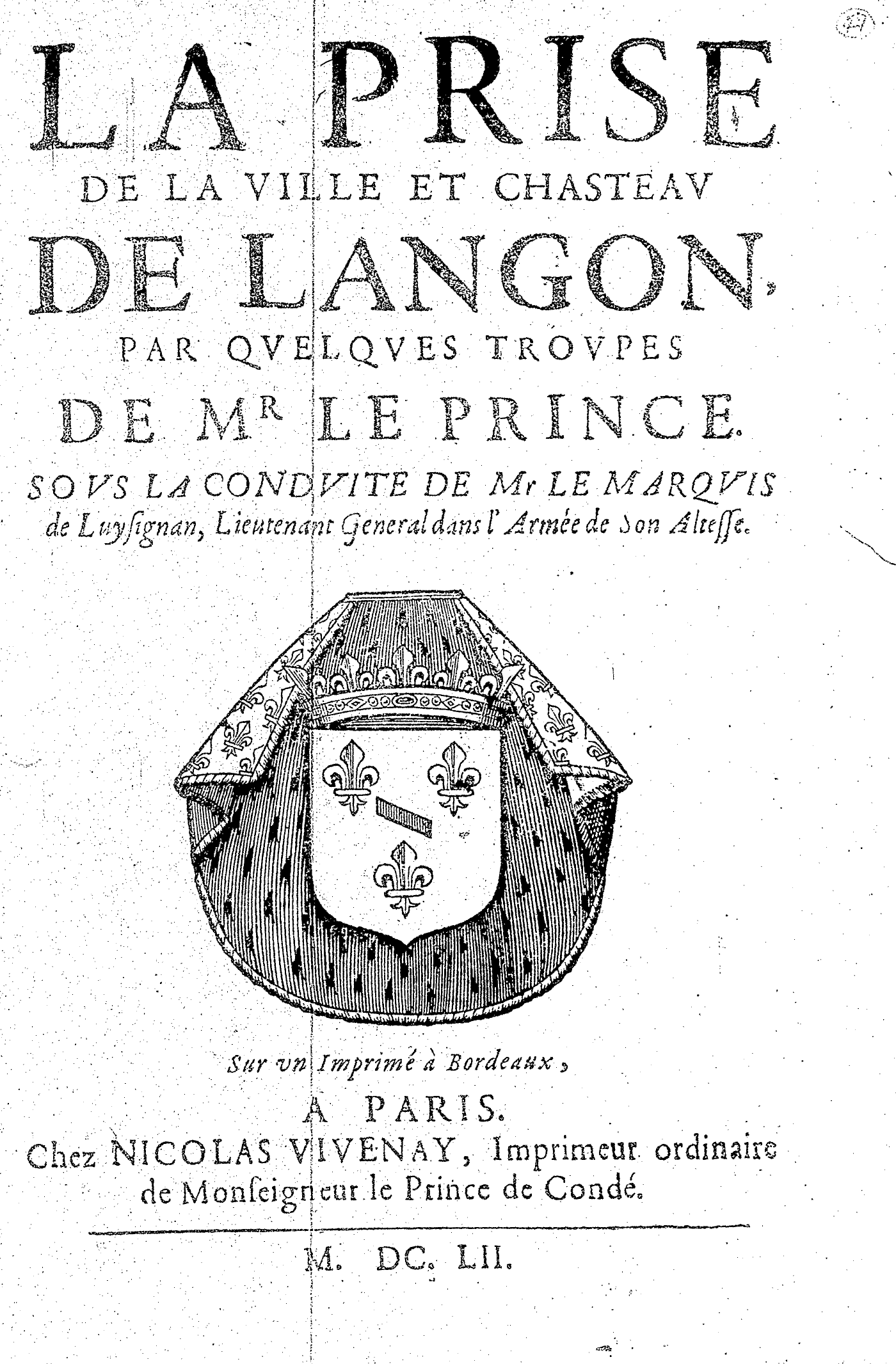 LA PRISE DE LA VILLE ET CHASTEAV DE LANGON, PAR QVELQVES TROVPES DE MR LE PRINCE. SOVS LA CONDVITE DE Mr LE MARQVIS de Luysignan, Lieutenant General dans l’Armée de Son Altesse.