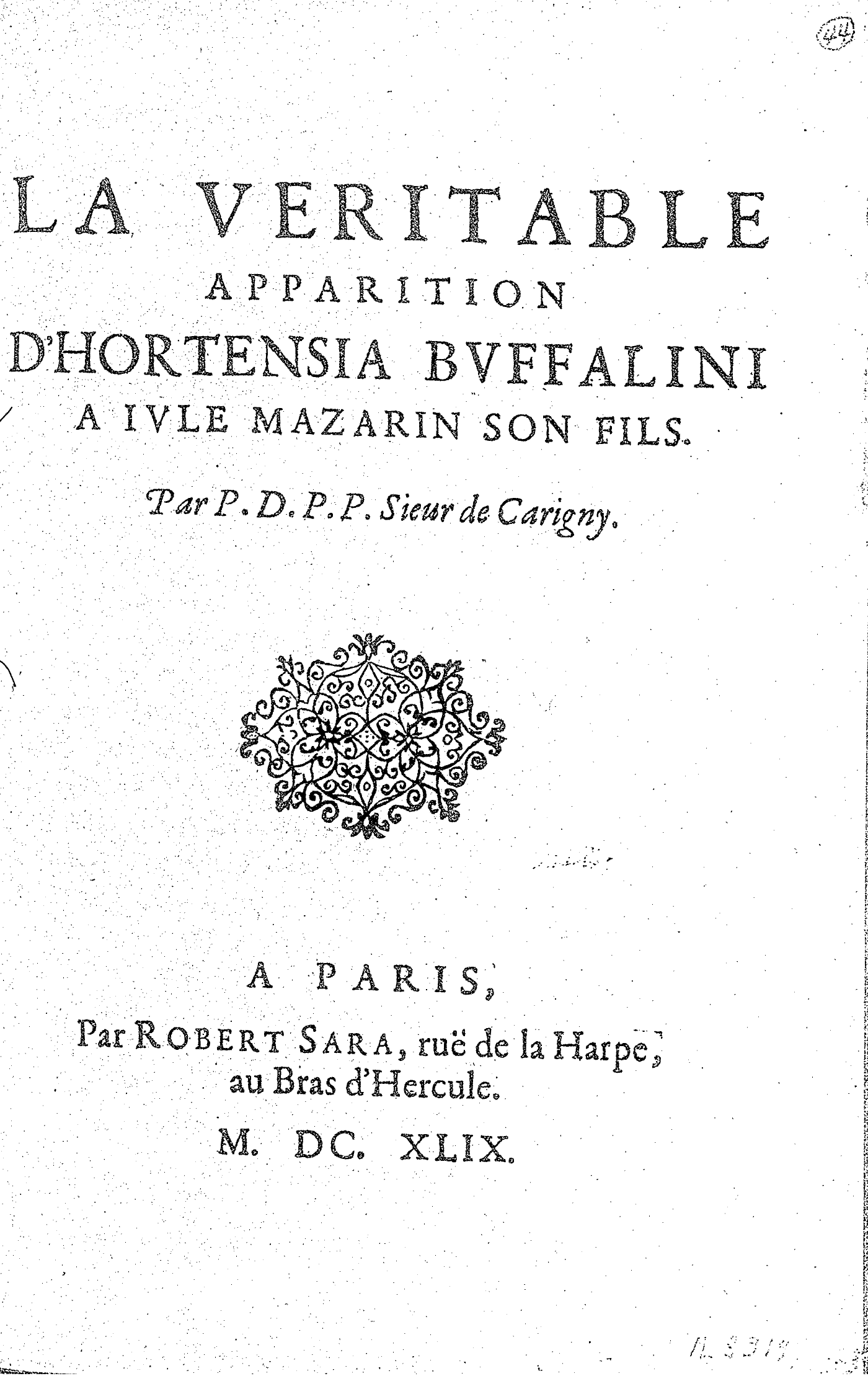 LA VERITABLE APPARITION D’HORTENSIA BVFFALINI A IVLE MAZARIN SON FILS. Par P. D. P. P. Sieur de Carigny.
