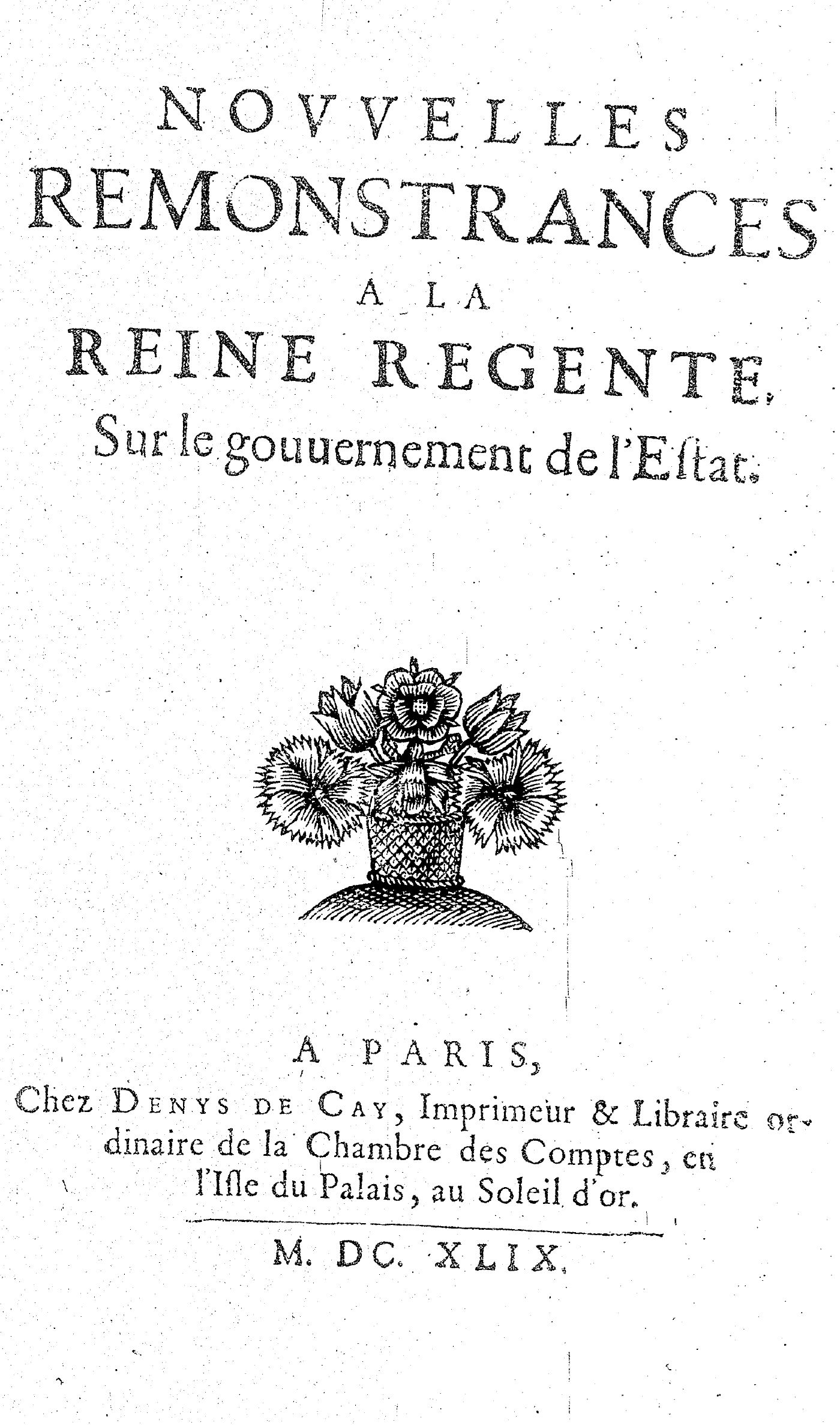 NOVVELLES REMONSTRANCES A LA REINE REGENTE, Sur le gouuernement de l’Estat.