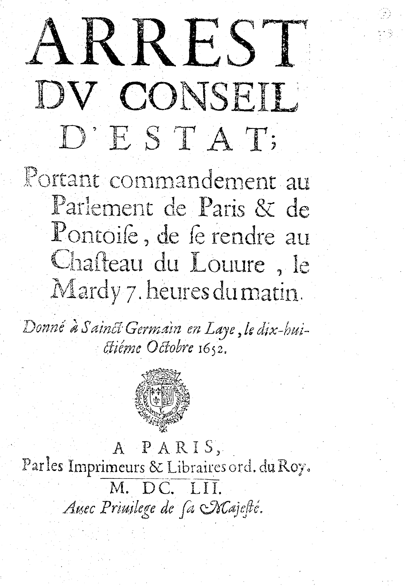 ARREST DV CONSEIL D’ESTAT ; Portant commandement au Parlement de Paris & de Pontoise, de se rendre au Chasteau du Louure, le Mardy 7. heures du matin.