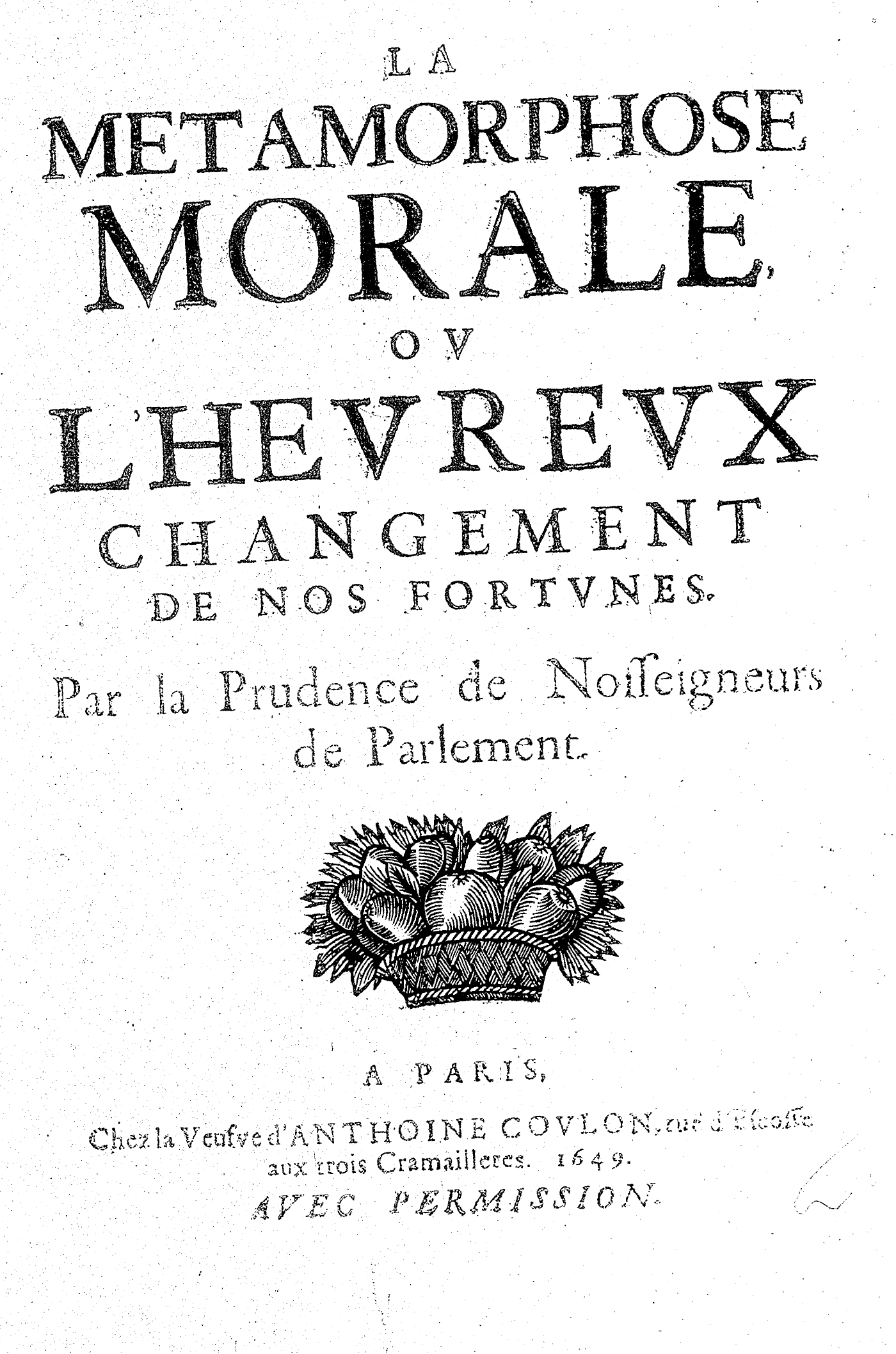 LA METAMORPHOSE MORALE, OV L’HEVREVX CHANGEMENT DE NOS FORTVNES. Par la Prudence de Nosseigneurs de Parlement.