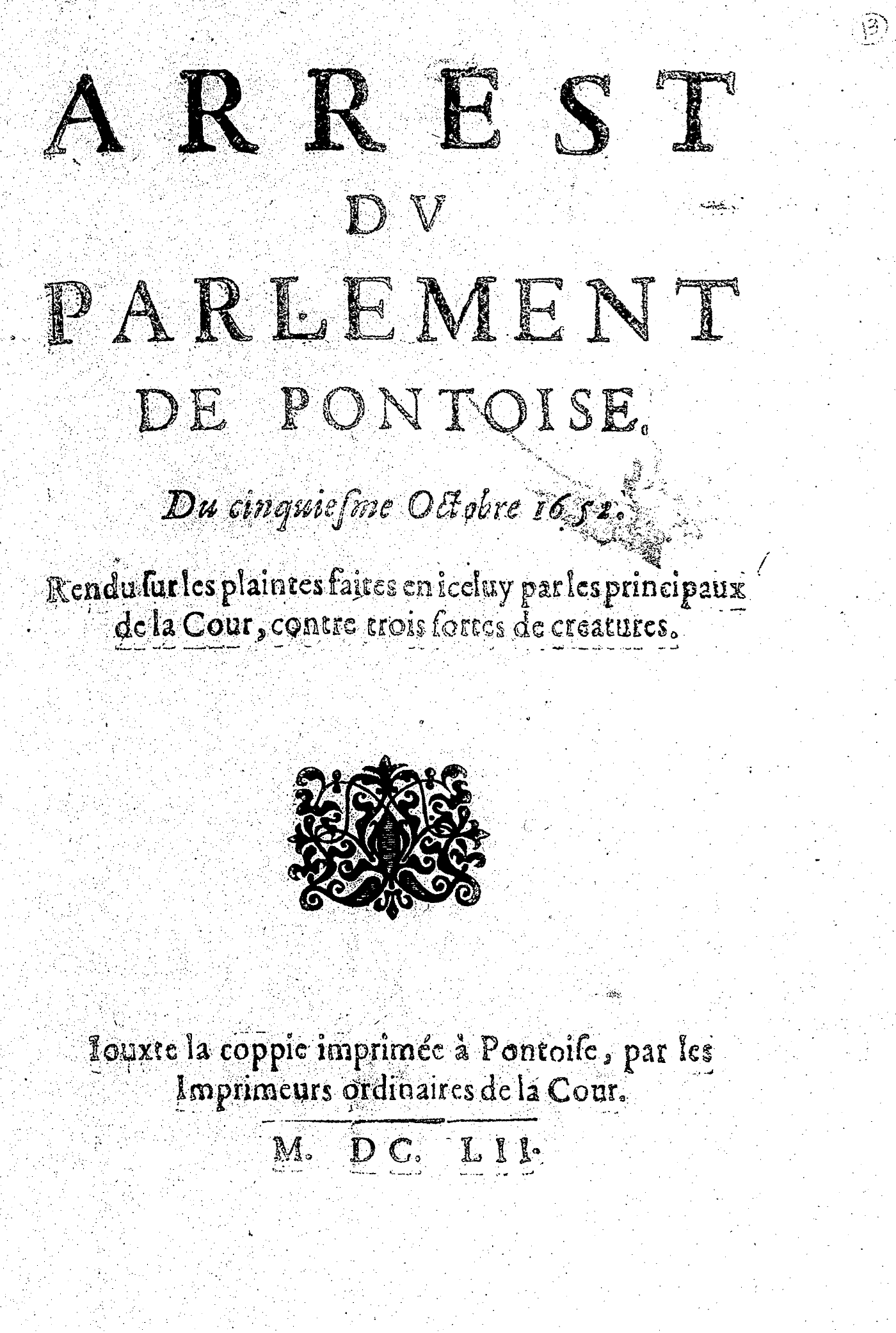 ARREST DV PARLEMENT DE PONTOISE. Du cinquiesme Octobre 1652. Rendu sur les plaintes faites en iceluy par les principaux de la Cour, contre trois sortes de creatures.