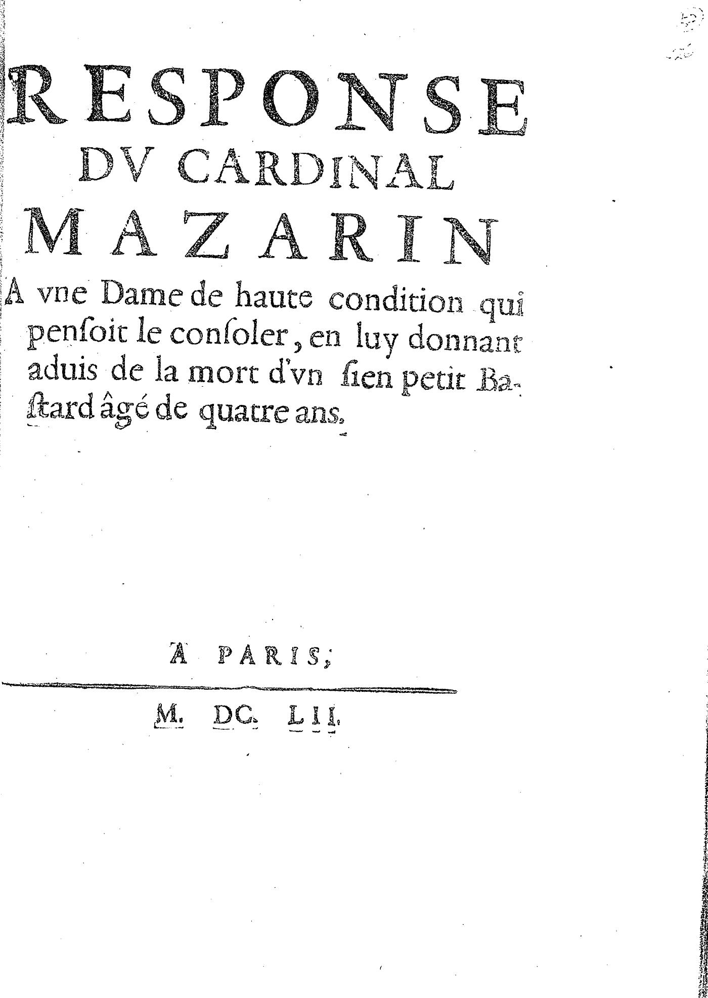 RESPONSE DV CARDINAL MAZARIN A vne Dame de haute condition qui pensoit le consoler, en luy donnant aduis de la mort d’vn sien petit Bastard âgé de quatre ans.