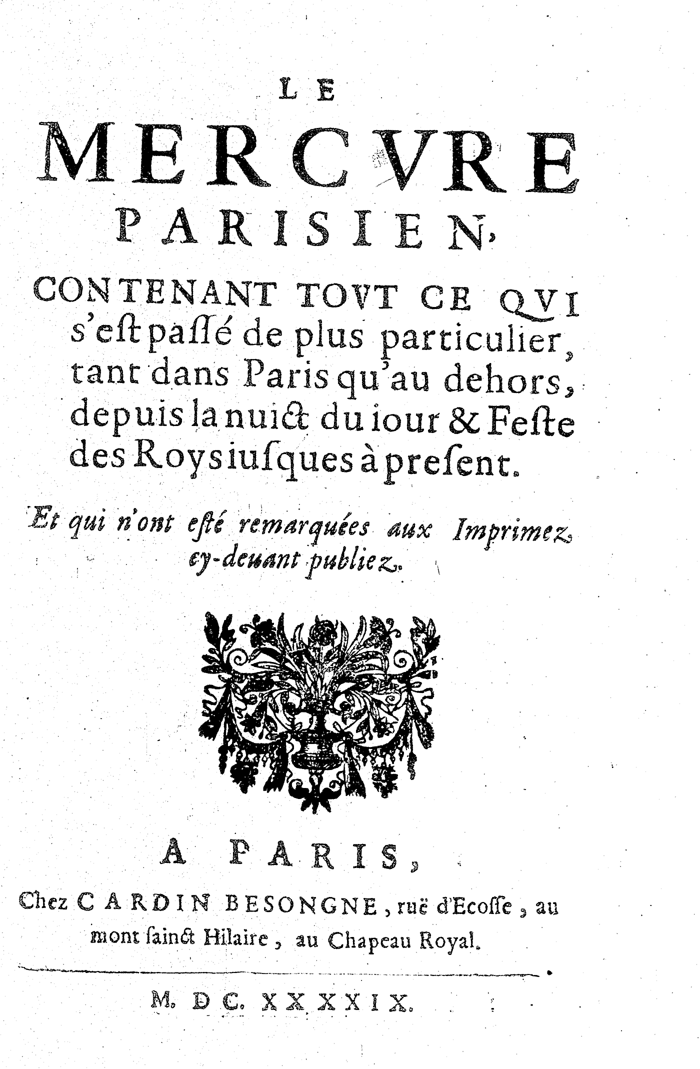 LE MERCVRE PARISIEN, CONTENANT TOVT CE QVI s’est passé de plus particulier, tant dans Paris qu’au dehors, depuis la nuict du iour & Feste des Roys iusques à present. Et qui n’ont esté remarquées aux Imprimez cy-deuant publiez.