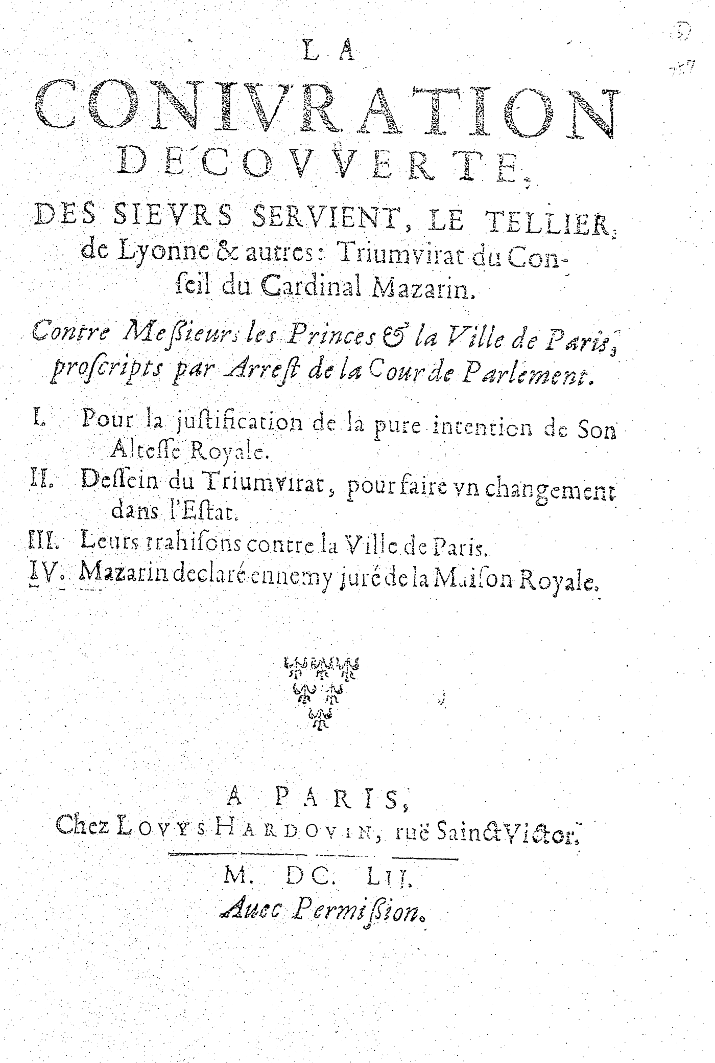 LA CONIVRATION DECOVVERTE, DES SIEVRS SERVIENT, LE TELLIER, de Lyonne & autres : Triumvirat du Conseil du Cardinal Mazarin. Contre Messieurs les Princes & la Ville de Paris, proscripts par Arrest de la Cour de Parlement. I. Pour la justification de la pure intention de Son Altesse Royale. II. Dessein du Triumvirat, pour faire vn changement dans l’Estat. III. Leurs trahisons contre la Ville de Paris. IV. Mazarin declaré ennemy juré de la Maison Royale.
