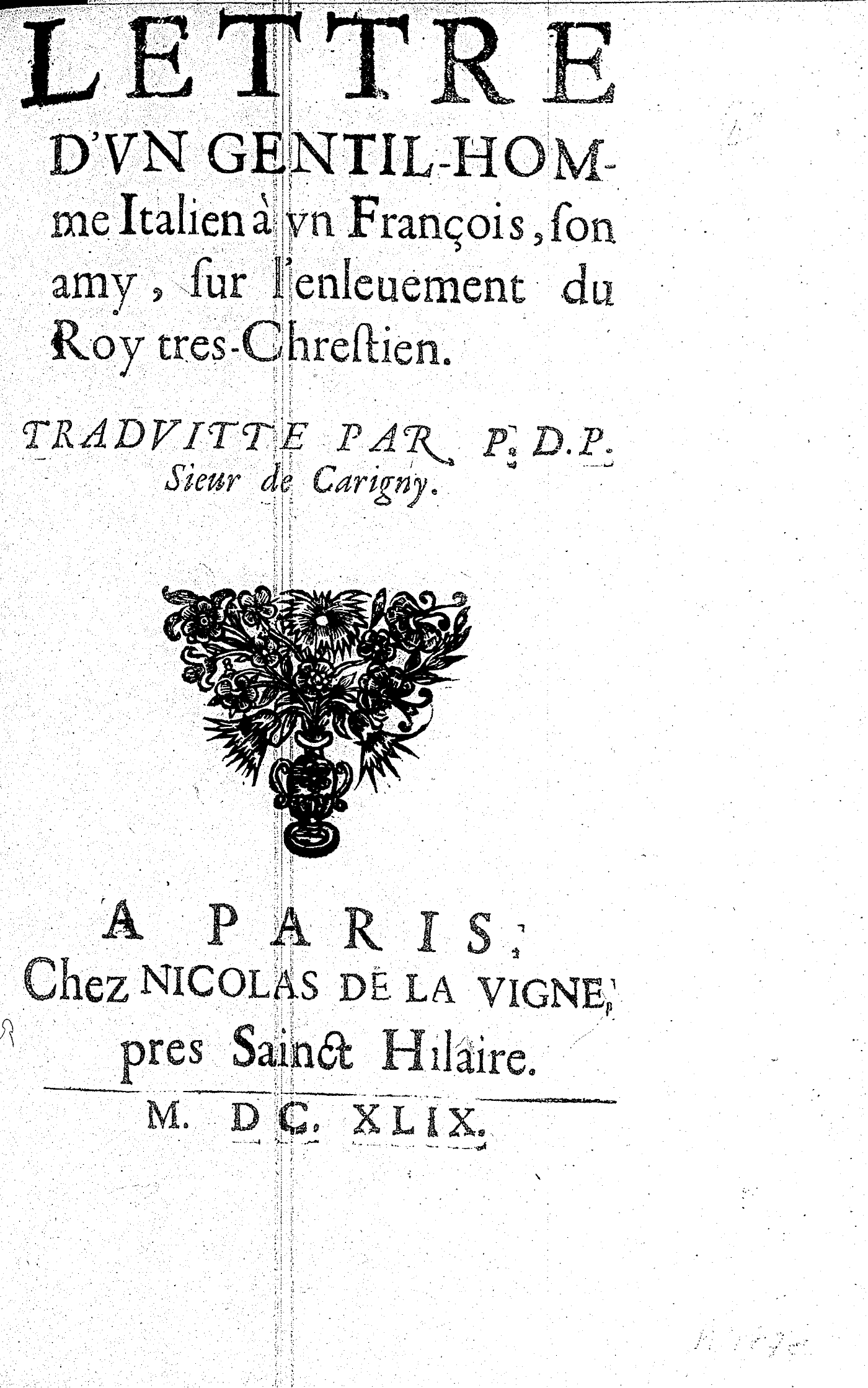 LETTRE D’VN GENTIL-HOMME Italien à vn François, son amy, sur l’enleuement du Roy tres-Chrestien. TRADVITTE PAR P. D. P. Sieur de Carigny.