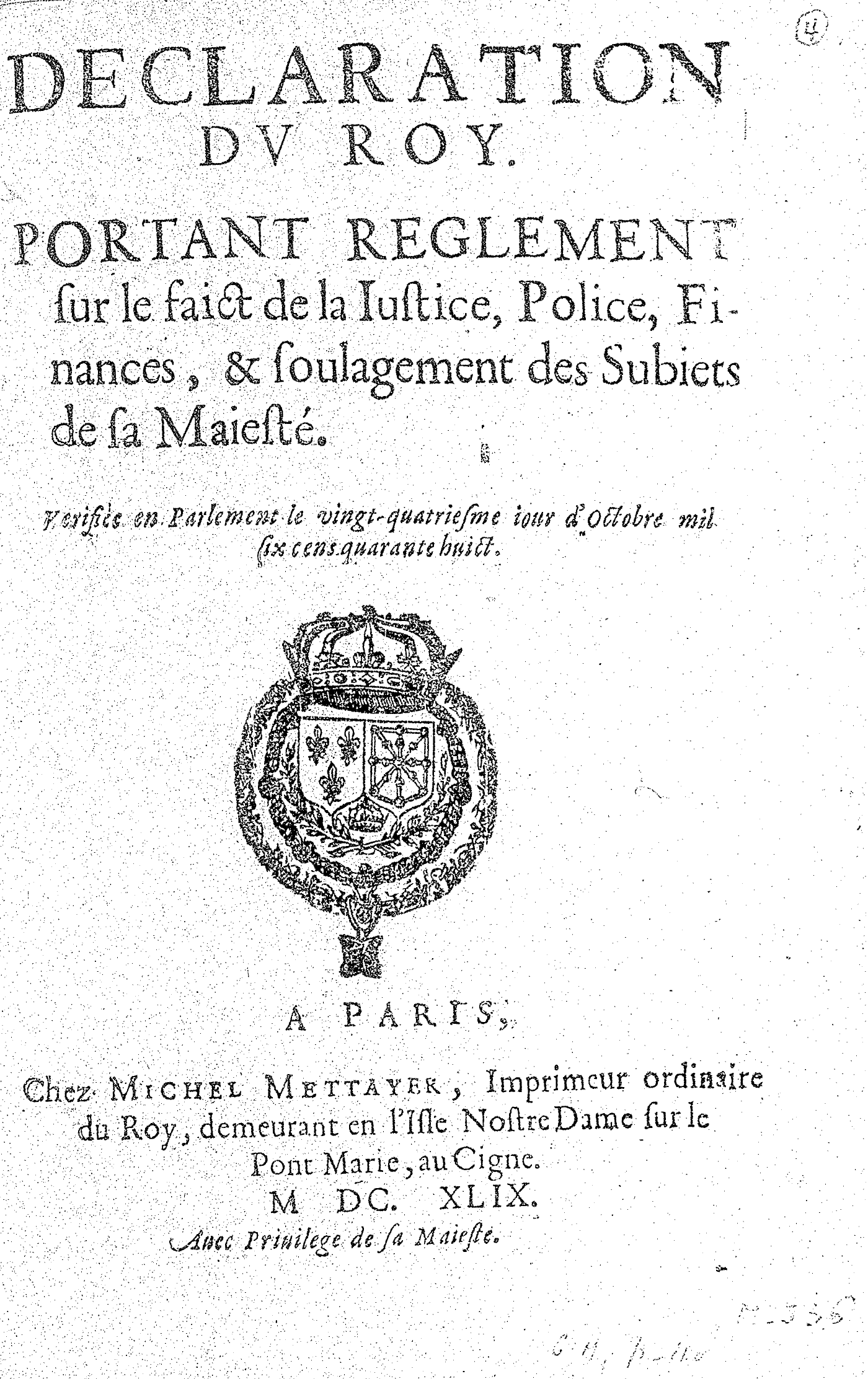 DECLARATION DV ROY. PORTANT REGLEMENT sur le faict de la Iustice, Police, Finances, & soulagement des Subiets de sa Maiesté.