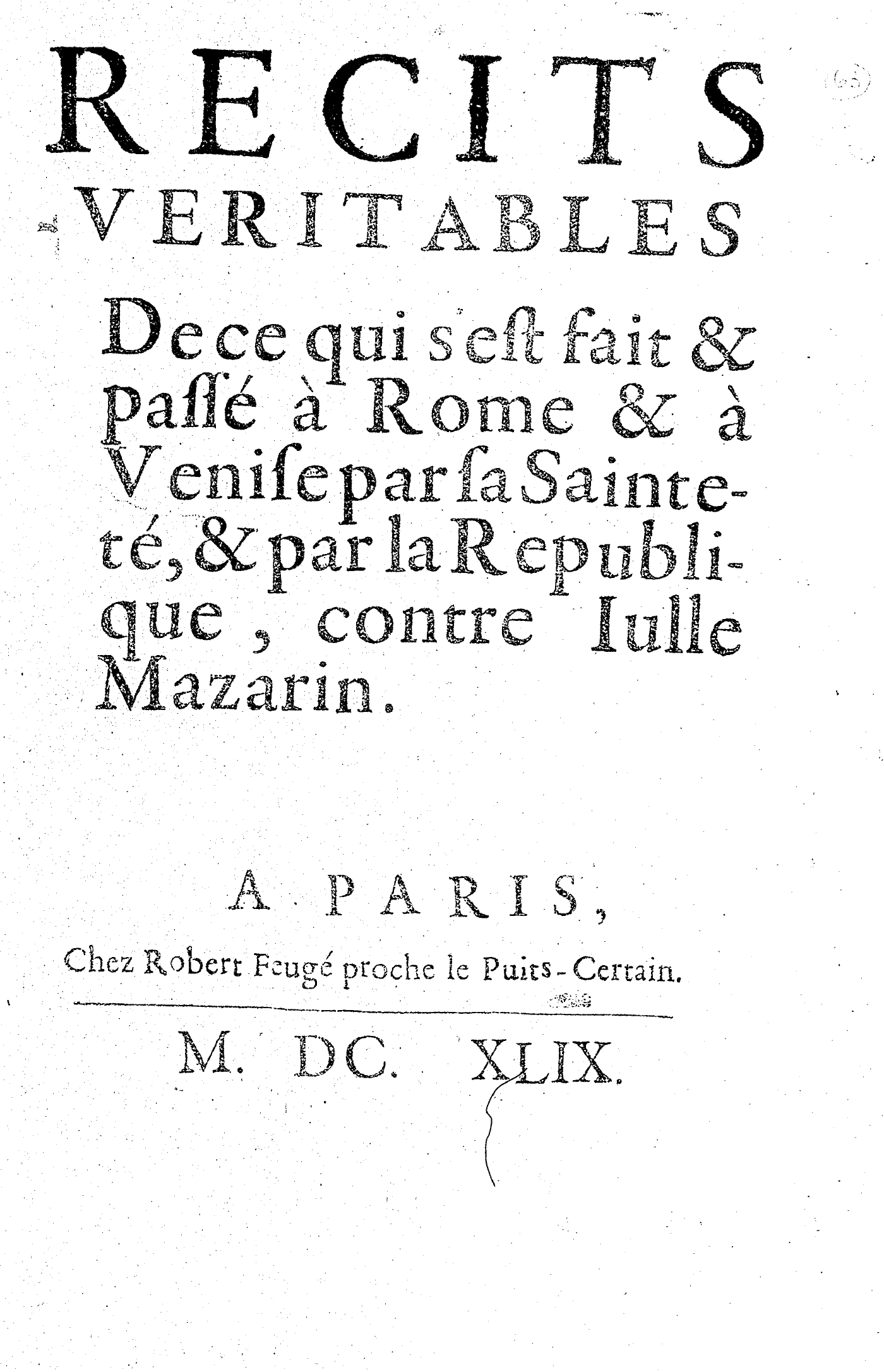 RECITS VERITABLES De ce qui s’est fait & Passé à Rome & à Venise par sa Sainteté, & par la Republique, contre Iulle Mazarin.