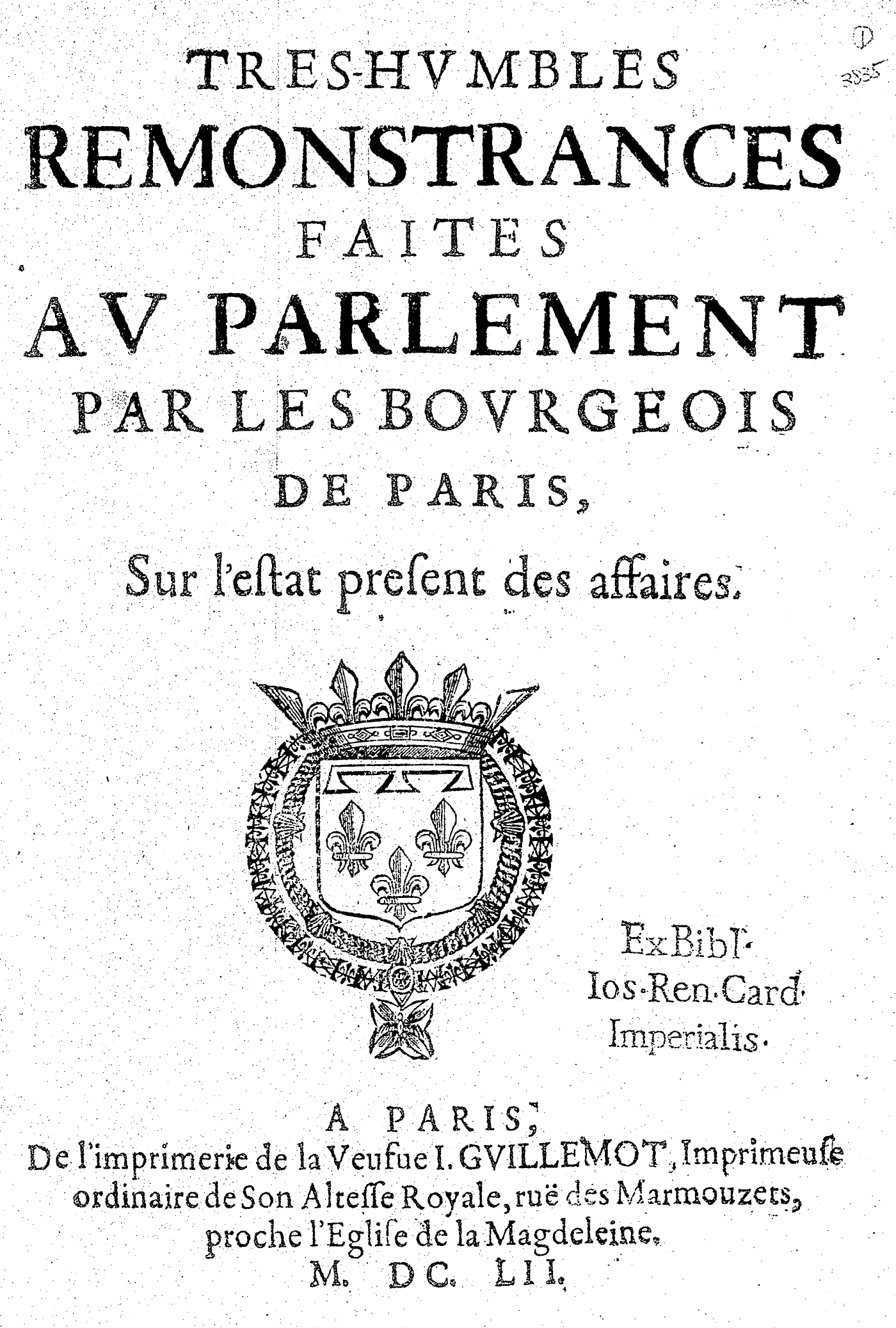 TRES-HVMBLES REMONSTRANCES FAITES AV PARLEMENT PAR LES BOVRGEOIS DE PARIS, Sur l’estat present des affaires.