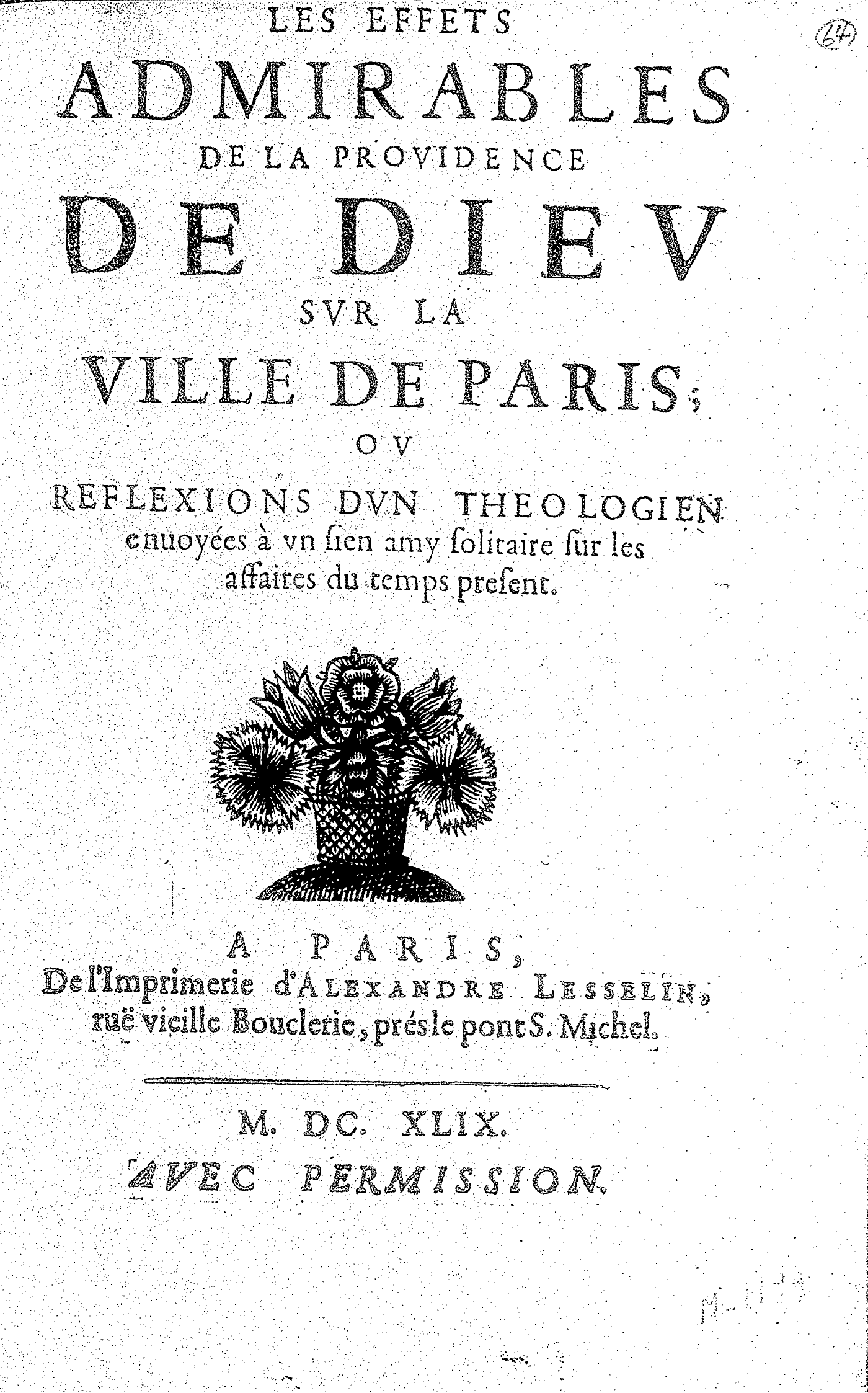 LES EFFETS ADMIRABLES DE LA PROVIDENCE DE DIEV SVR LA VILLE DE PARIS ; OV REFLEXIONS DVN THEOLOGIEN enuoyées à vn sien amy solitaire sur les affaires du temps present.