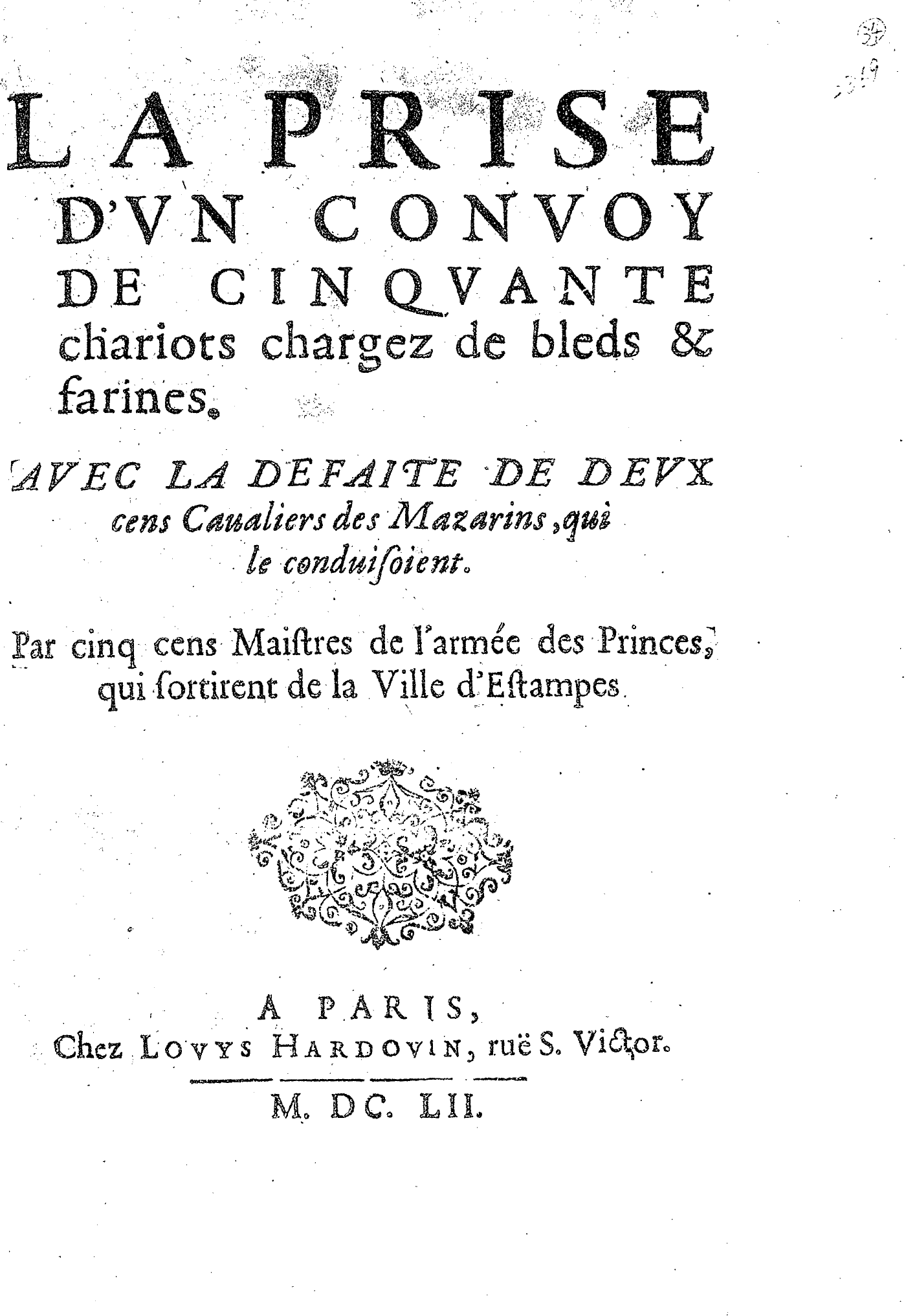 LA PRISE D’VN CONVOY DE CINQVANTE chariots chargez de bleds & farines. AVEC LA DEFAITE DE DEVX cens Caualiers des Mazarins, qui le conduisoient. Par cinq cens Maistres de l’armée des Princes, qui sortirent de la Ville d’Estampes.