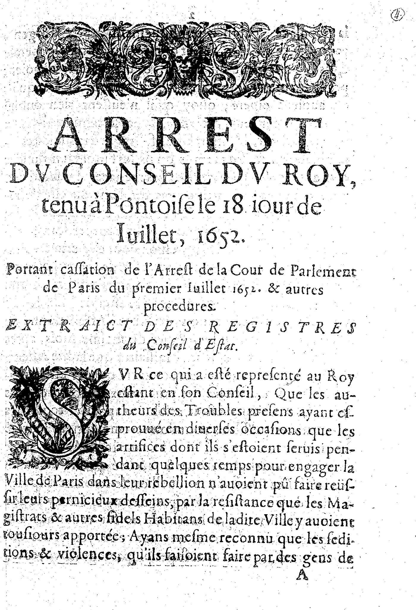 ARREST DV CONSEIL DV ROY, tenu à Pontoise le 18 iour de Iuillet, 1652. Portant cassation de l’Arrest de la Cour de Parlement de Paris du premier Iuillet 1652. & autres procedures.