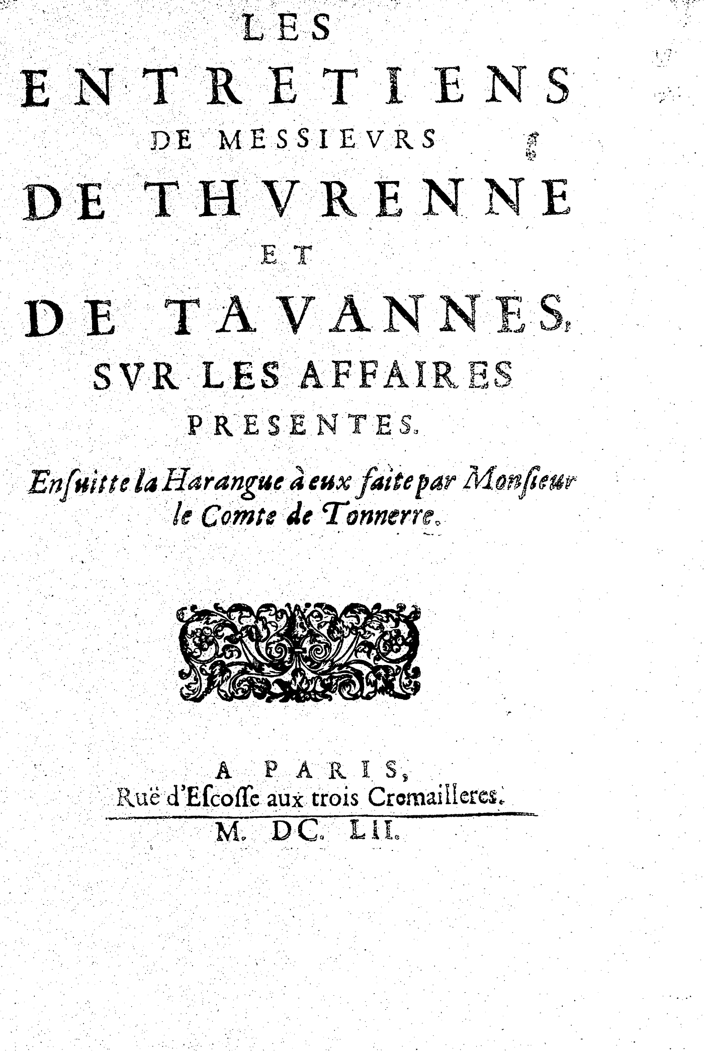 LES ENTRETIENS DE MESSIEVRS DE THVRENNE ET DE TAVANNES, SVR LES AFFAIRES PRESENTES. Ensuitte la Harangue à eux faite par Monsieur le Comte de Tonnerre.
