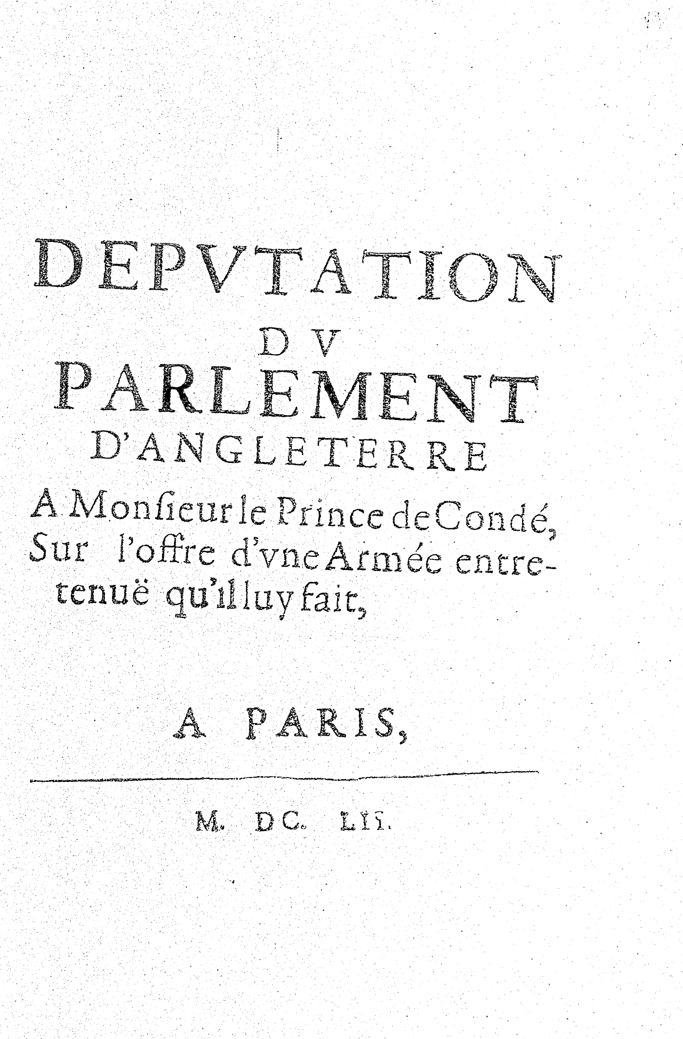 DEPVTATION DV PARLEMENT D’ANGLETERRE A Monsieur le Prince de Condé, Sur l’offre d’vne Armée entretenuë qu’il luy fait