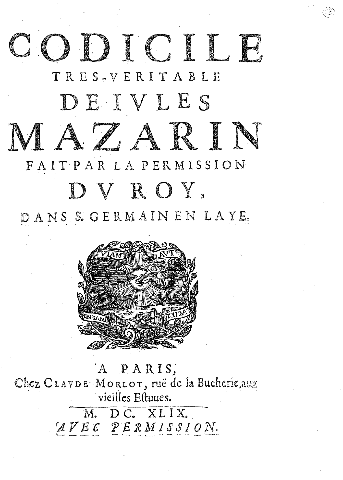 CODICILE TRES-VERITABLE DE IVLES MAZARIN FAIT PAR LA PERMISSION DV ROY, DANS S. GERMAIN EN LAYE.