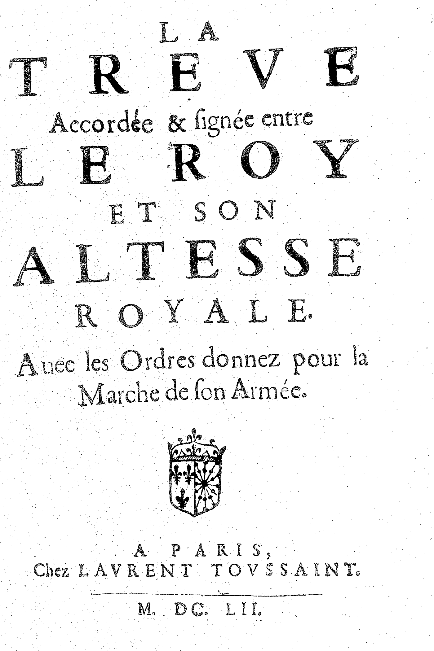 LA TREVE Accordée & signée entre LE ROY ET SON ALTESSE ROYALE. Auec les Ordres donnez pour la Marche de son Armée.