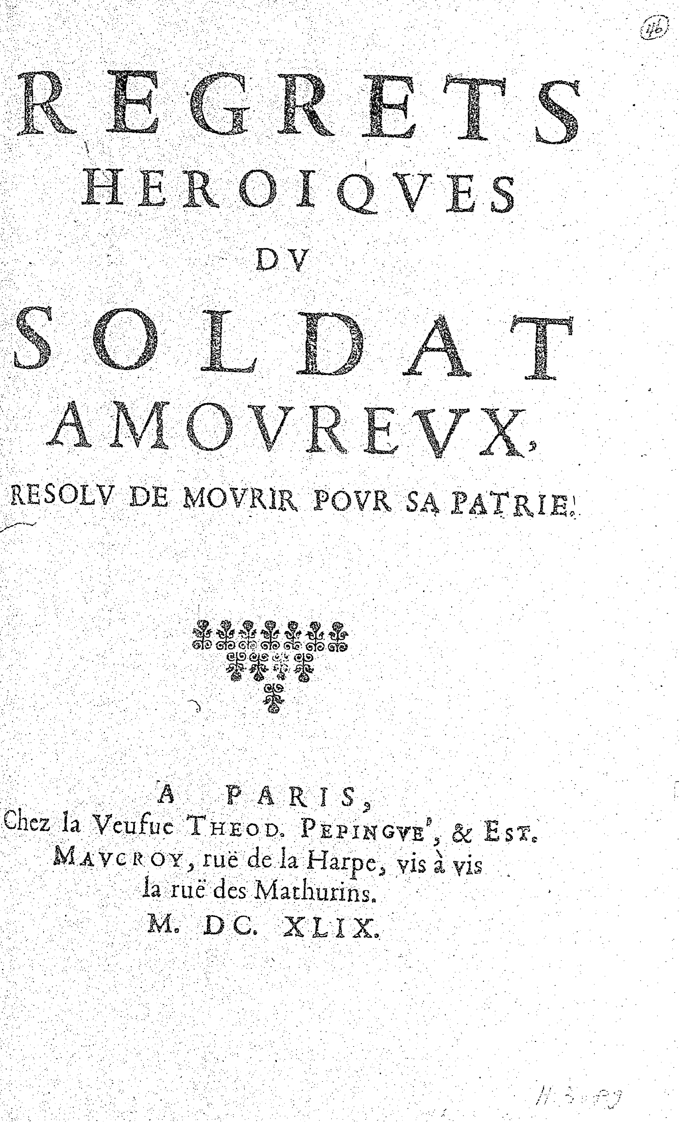 REGRETS HEROIQVES DV SOLDAT AMOVREVX, RESOLV DE MOVRIR POVR SA PATRIE.